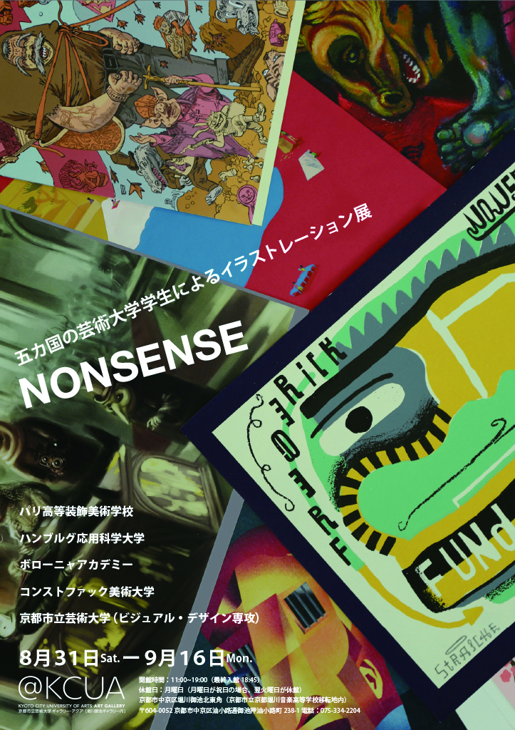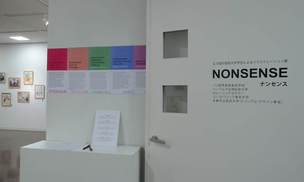 京都芸大ビジュアルデザイン専攻では、2008 年度 か ら 欧 米 の 大 学 と 、 イ ラ スト レ ー シ ョ ン の 共 同 授 業 を 行 っ て い る 。 今 年 度 は「 ナ ン セ ン ス 」 を テ ー マ に 、 フランス、ドイツ、イタリア、スウェーデン、そして 日本という五カ国の芸術大学学生が参加した。各 校 20 点、合計 100 点の作品が出品された。