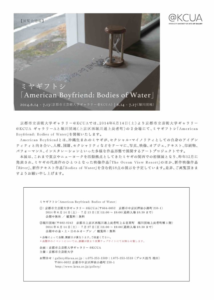 東京やニューヨークを活動拠点としてきたミヤギフトシの関西での初個展を開催。沖縄生まれの ミヤギが,セクシャル・マイノリティとしての自身のアイデンティティと向き合い,人種,国籍, セクシャリティなどをテーマに,写真,映像など多様な作品形態で展開するアートプロジェクト 「American Boyfriend 」の作品を中心に,代表作のひとつである映像作品《The Ocean View Resort 》のほか,新作映像作品《River 》,新作テキスト作品《Bodies of Water》を含む約18点を Gallery A,堀川団地(上京区西堀川通上長者町)の2会場で展示した。