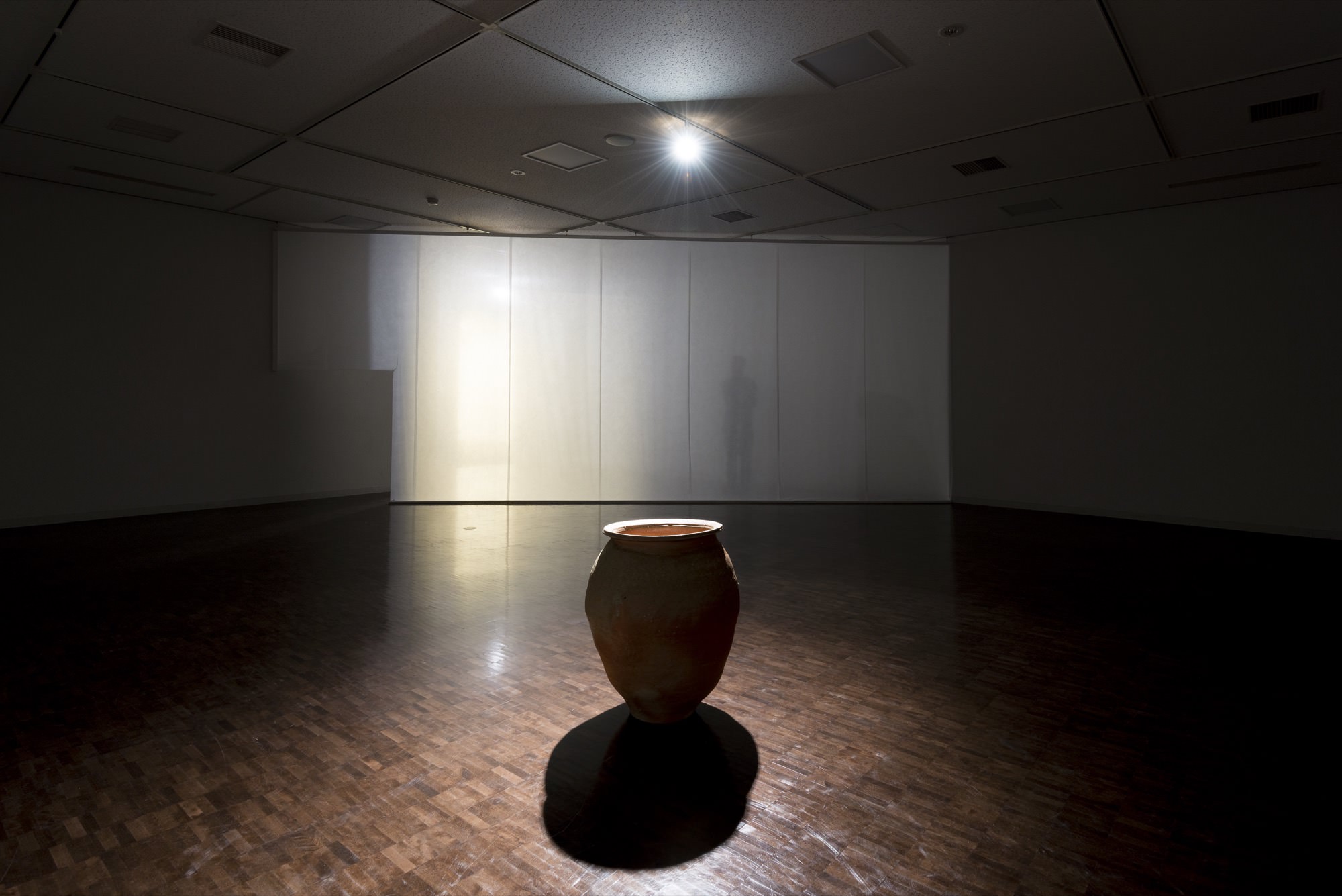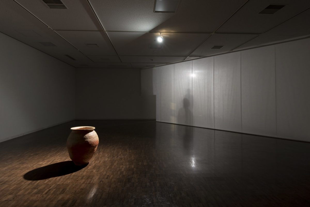 谷は窯元の生まれではあるが、まず「やきもの」ではなく「彫刻」を学び、「もの」が存在する空間をも意識して立体造形を行ってきた。「やきもの」に取り組み始めてからは、室町時代に信楽で作られていた「古信楽」を再び作り出し、室町時代の人々の美意識と遊び心を現代的な視点から捉え返すことを目指している。本展において谷は、空間を設え、その中に甕(かめ)を一点据えた。「古信楽」が纏う空気のようなものを作りたいのだと語る彼が、これまで成し遂げてきた「古信楽」に関する技術や思考の一歩先にある表現をさらに追求していこうとする強い意志がそこには現れていた。