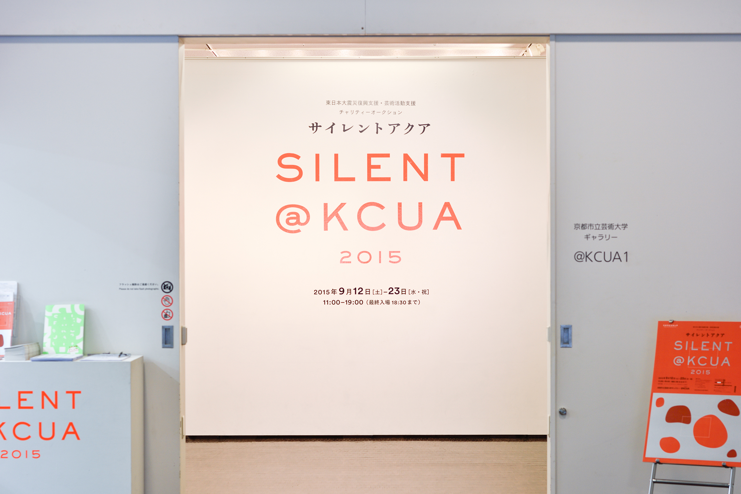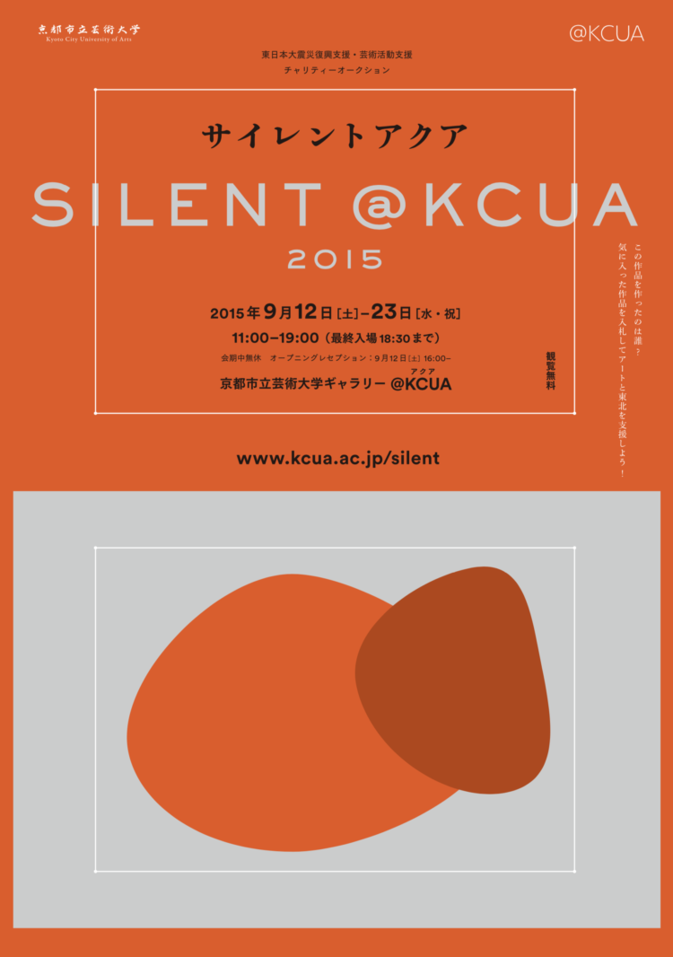 チャリティーオークション「SILENT @KCUA(サイレントアクア)」は、東日本大震災の復興に関 わる活動をしている団体等を広く支援することを目的として、2011年より10年間の継続を目標として実施している。入札方法にサイレントオークションを採用し、さらに作家名を伏せて作品を展示するという形式をとっている。本年度は、ハガキサイズ程度の平面作品という従来の規定に新たに10cm立方程度の立体作品を加え、本学の学部生、院生、留学生、教員(非常勤含む)、旧教員、卒業生、修了生など本学ゆかりの作家194名から437点が集まった。収益の7割を被災地にて芸術を通したボランティア活動、支援活動を行っている団体への活動資金として、また3割を京都市立芸術大学に在籍する学生の芸術活動の支援金( 留学支援・奨学金 )として寄付を行った。