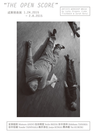 アメリカ・ロサンジェルスで活動するサラ・ララとルーク・フィッシュベックによるアーティストグループ ラッキー・ドラゴンズを講師に迎え,レクチャーと実習を通じたワークショップの成果発表展。本ワークショップでは, ラッキー・ドラゴンズが考案した「The Open Score」と呼ばれるワークショップを約2 週間に亘り実践した。スコアScoreは通常「楽譜・譜面」と訳すが,ここでは「実践方法」や「作り方」が書面化されたものを広義に指す。本展では,ワークショップで作成されたスコアを,パフォーマンス,ドキュメンテーション,成果物,説明書として展示公開した。