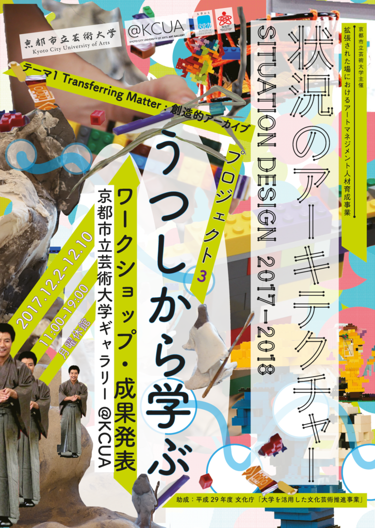 拡張された場におけるアートマネジメント人材育成事業「状況のアーキテクチャー」2017年度テーマ1〈物質〉「Transferring Matter: 創造的アーカイブ」プロジェクト3「うつしから学ぶ」では、京都市立芸術大学芸術資料館が収蔵している資料や伝統音楽の譜面を用いて、「うつす」行為によって別の形態や様式が発露するさまを体感できる三つのワークショップを開催した。また、その「うつし」の教育現場での活用法の会得を目標とした。受講者は三つのワークショップから各対象に合うものを選んで参加し、本展においてその成果を展示・発表した。