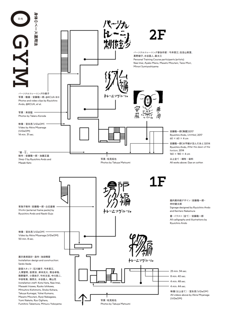 11:00–22:00 展示鑑賞・トレーニング(セルフ):ものづくりの観点から出発した身体運用法を「身体0ベース運用法」と名付け、そのあり方を探る染色作家、安藤隆一郎の理念のもと、@KCUAに「0 GYM」が出現。今春より実施中の美術作家を対象としたパーソナルトレーニングの過程も公開。展示を鑑賞するだけでなく、実際に「身体0ベース運用法」のトレーニングを行うことができます!