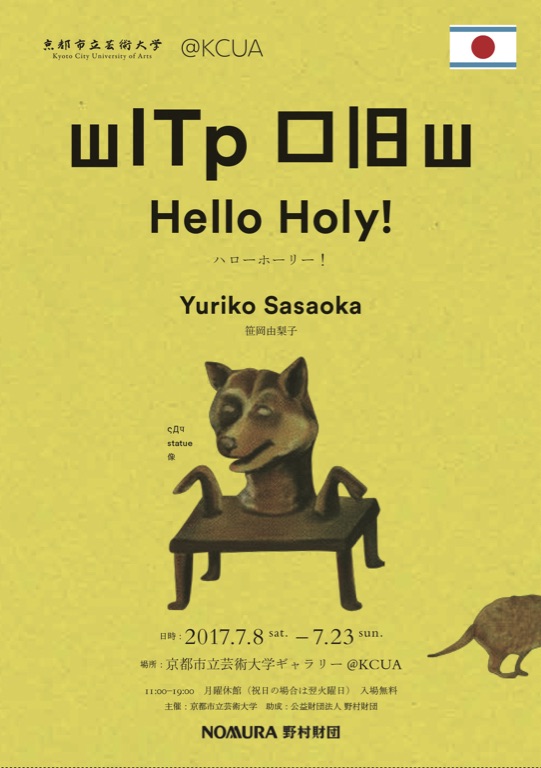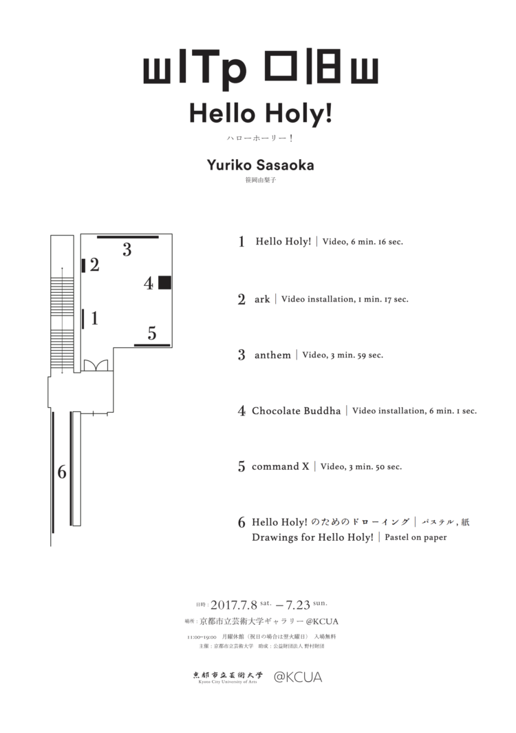 本展「Hello Holy!」にて笹岡は、「建国」をテーマに、アニメーション・実写・ビデオコラージュなど様々な映像形式を用いて制作した2点のビデオインスタレーションと3点のビデオ、そしてそれらに用いた一連のドローイングを発表。「絵画のように鑑賞者が想像力を働かせ、作品と対話を試みる。そんなビデオ作品を作ることは可能か」という、ビデオ作品に対しての笹岡の原点となる考えを強く反映させたものとなった。また、作家が独自に制作した「ホロル語」で話される架空の国の物語は、リファレンスや文化を混ぜ合わせることにより、新しいビデオ表現の可能性に言及している。既存の概念に囚われないカオティックな作品の根底には旧約聖書の十戒や創世記も題材とする壮大なストーリーがあり、「ホロル語」を用いることによって言葉による理解に頼らない、普遍性の高い鑑賞体験を作り出していた。