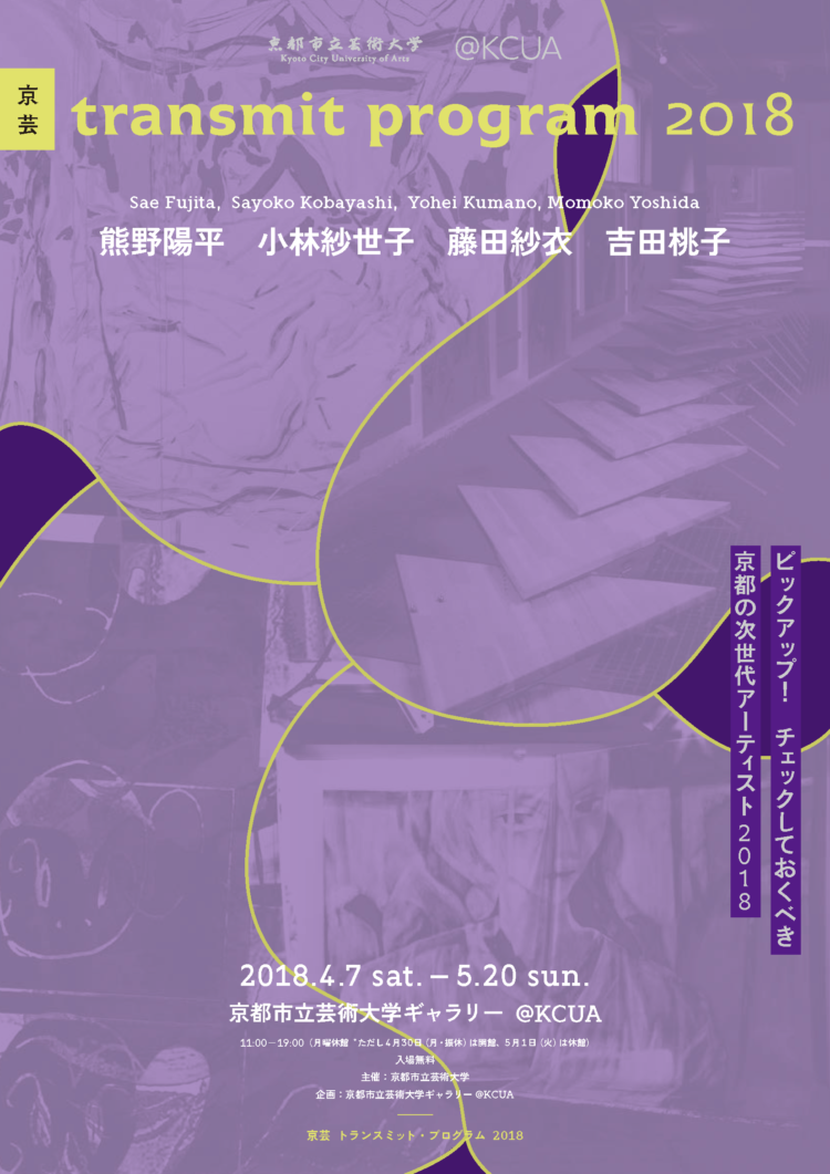 「京芸 transmit program」は、アーティストの活動場所として日本でも1、2を争う都市京都における期待の新星を紹介するシリーズとして、京都市立芸術大学卒業・大学院修了3年以内の若手作家の中から、いま、@KCUAが一番注目するアーティストを紹介するプロジェクトである。第2弾となる本年は、熊野陽平(構想設計)、小林紗世子(日本画)、藤田紗衣(版画)、吉田桃子(油画)の4名を選出した。