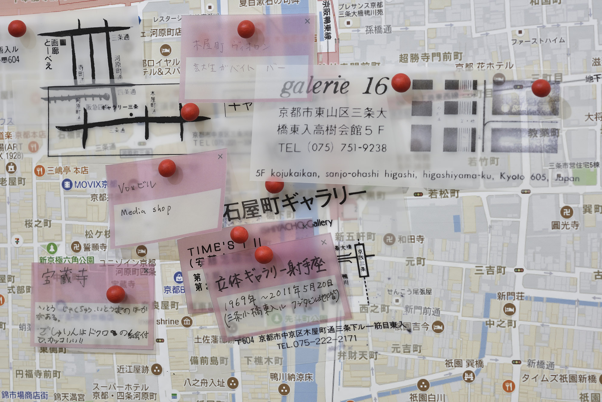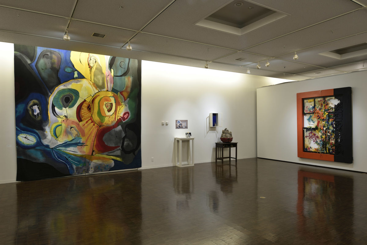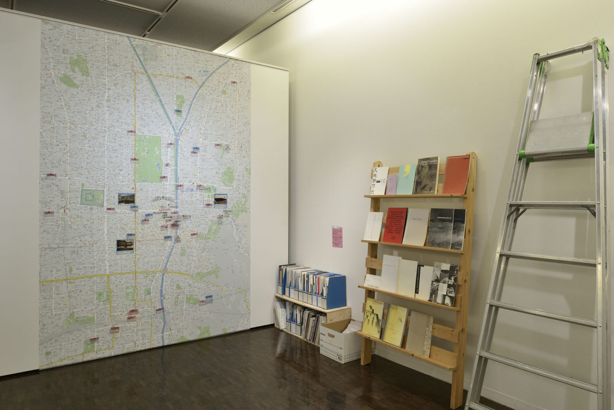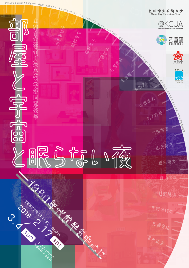 1980年代の卒業・修了作品を中心に紹介した2016度の同窓会展に引き続き、1990年代前半の作品を扱った。1990年代前半とは、国外において は東西ドイツの統一と冷戦終結、ソ連解体とグローバル化の加速、湾岸戦争での多国籍軍によるイラクへの攻撃などが、日本国内においては、バブル経済のピークからその崩壊、そして阪神・淡路大震災、地下鉄サリン事件が人々に大きな衝撃を与え、のちの社会を大きく動かすことになる現象や出来事のあった激動の時代であった。美術界の動きとしては、このような社会の動きからか、自らの新たな立ち位置を模索するような傾向が見られるようになる。また、貸画廊ではなく、オルタナティブな作品発表の場所を自分たちで開拓していくような動きも若手作家の中で活発化するのだが、本学学生たちも例外ではなく、学生の下宿アパートなどさまざまな場所を展示の場として使用するようになっていく。90年代前半は 、 バブル崩壊から「失われた20年と も呼ばれる長く続いた不景気の始まりというネガティブなイメージで捉えられがちな時代でもあるが、本展にて展示した作品からは、この時期特有の若き表現者たちの躍動感、高揚感を見て取ることができた。また、同じく2016年度の同展に引き続き、資料研究(状況のアーキテクチャー2017 プロジェクト2「Still Moving: The ’80s」)の発表の場としての「アーカイバル・プラクティス・ラボ」の公開も合わせて実施した。 二つの壁面にはプロジェクトメンバーによって制作された80年代から90年代前半の年表と京都市内の地図とを設置した。来場者も自由に情報を付け 加えることを可能としたところ、同窓会生からは当 時の本学や学生の動向に関する情報が、また一般の来場者からはより広い視点での情報が得られた。また、「 眠らない夜のアーカイブ会議」と題して、原久子氏には主に編集者としての視点から、島敦彦氏 にはキュレーターとしての視点から捉えられた当時の状況を語って いただいた。「部屋と宇宙と眠らない夜」では、収蔵場所の問題もあり買上対象から外れたこともあって彫刻作品の展示がなかったのだが、1992年に国立国際美術館にて開催された「彫刻の遠心力」展についての島氏による詳細な解説は、それを補完して余りある貴重なものとなった。