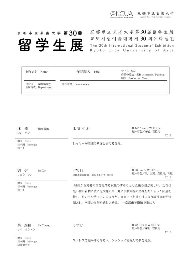 京都市立芸術大学に在学する留学生と市民との交流機会として、毎年冬に開催される本展では、修士課程の本科留学生、研究留学生、交換留学生による作品が展示された。