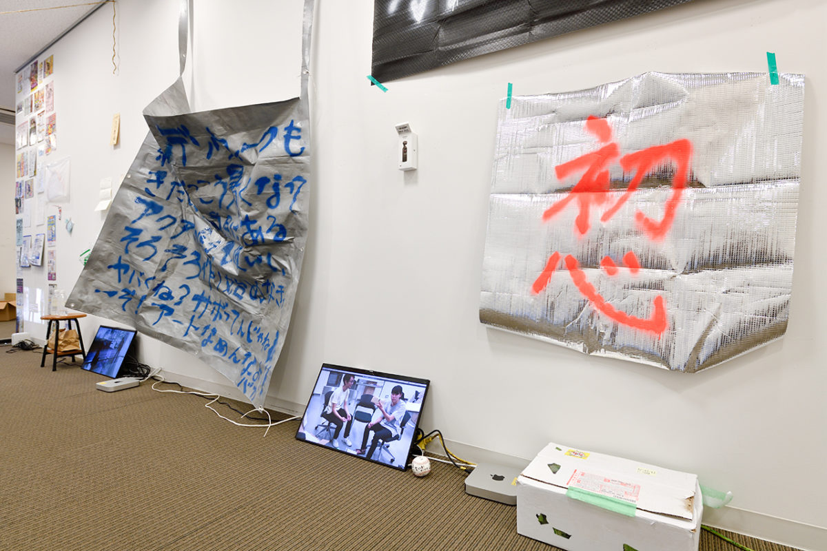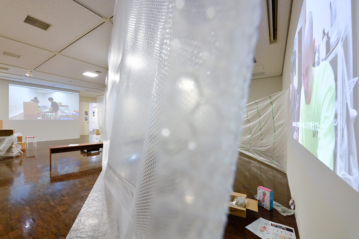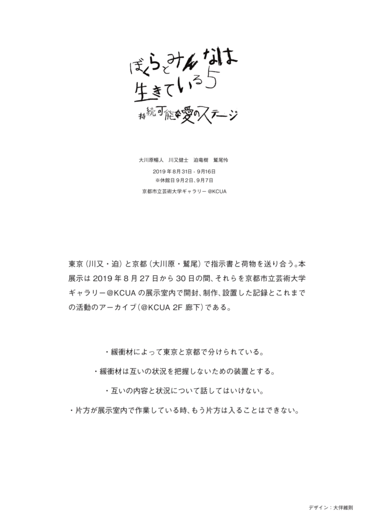 京都を拠点とする大川原暢人、鷲尾 怜と、東京を拠点とする川又健士、迫 竜樹の大学院生4名からなる「ぼくら」は、離れた場所でお互いの絆を確かめ合うため、指示書と荷物を送り合う。本展では@KCUAの展示室内でそれらを開封、制作、設置した記録と、「ぼくら」のこれまでの活動のアーカイブが展示された。