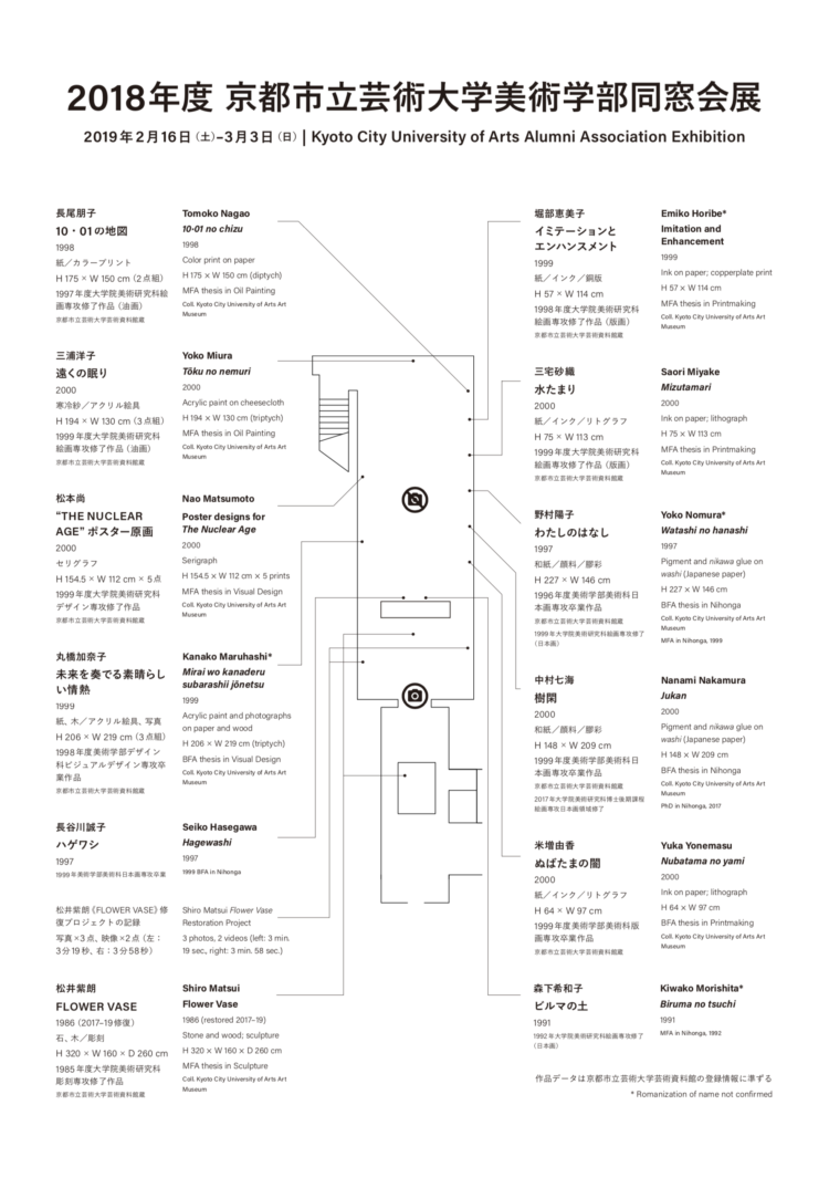 京都市立芸術大学芸術資料館の収蔵品である松井紫朗《FLOWER VASE》(1985年度 京都市立芸術大学大学院美術研究科彫刻専攻修了作品)の修復プロジェクトの成果発表に加え、1990年代に在学した美術学部同窓会員が当時制作した作品を展示した。