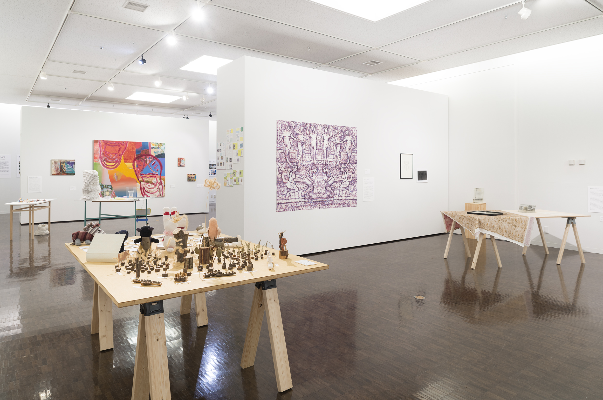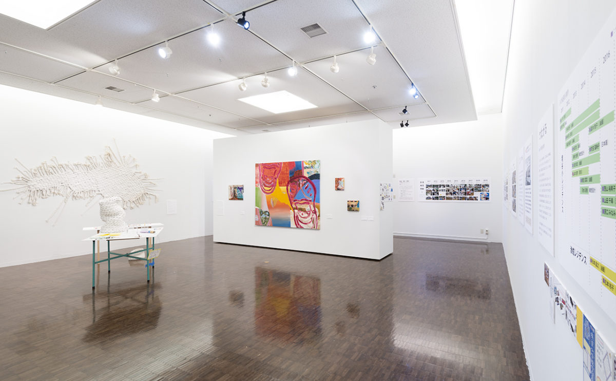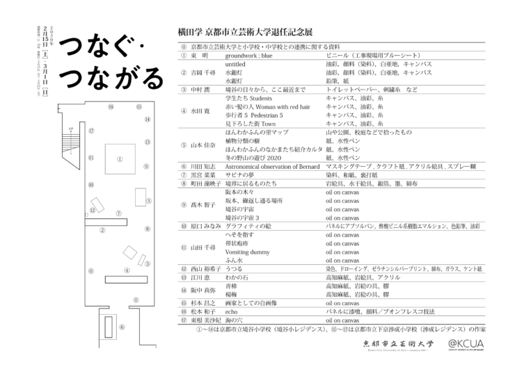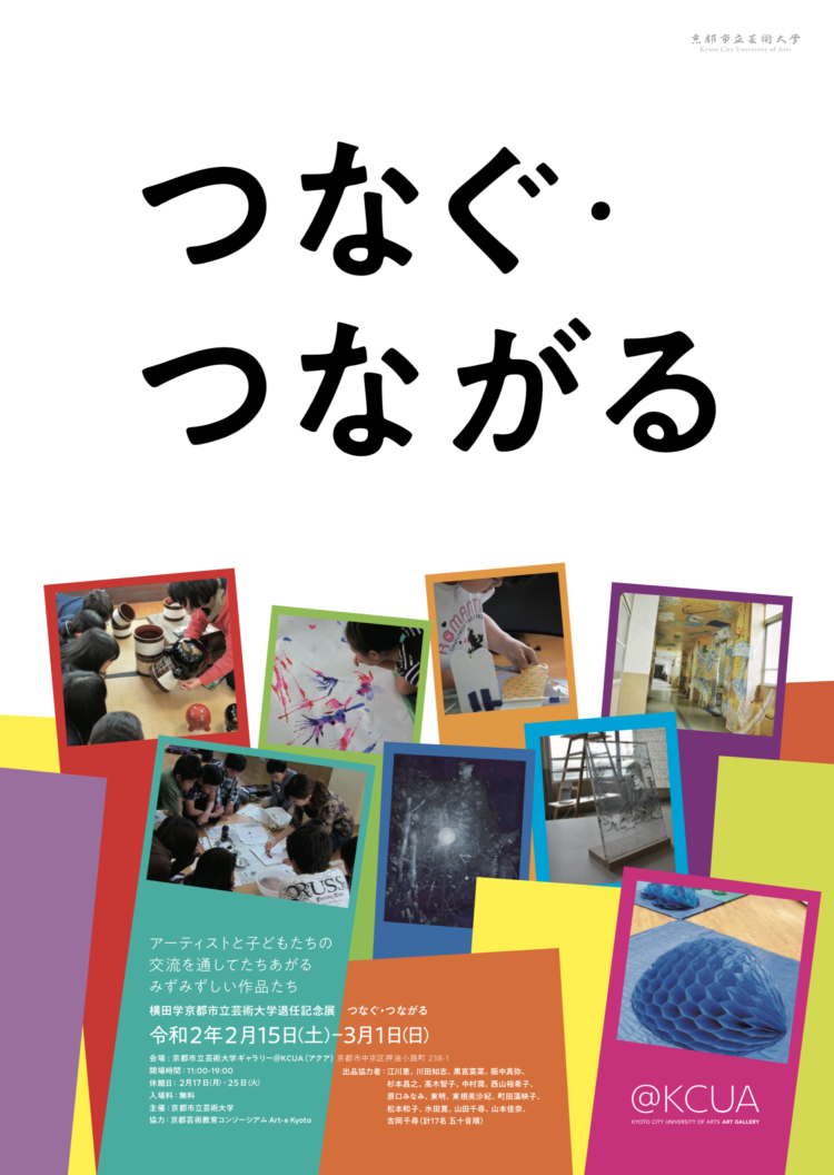 本学美術学部教授・横田学(専門:美術教育学・教育方法学)の退任記念展として、小・中学校との連携研究の実践記録「つなぐ」と、京都市立境谷小学校「境谷小レジデンス」や京都市立下京渉成小学校「渉成レジデンス」に参加した本学出身の若手作家の作品などの展示「つながる」の2部構成で展示を行った。