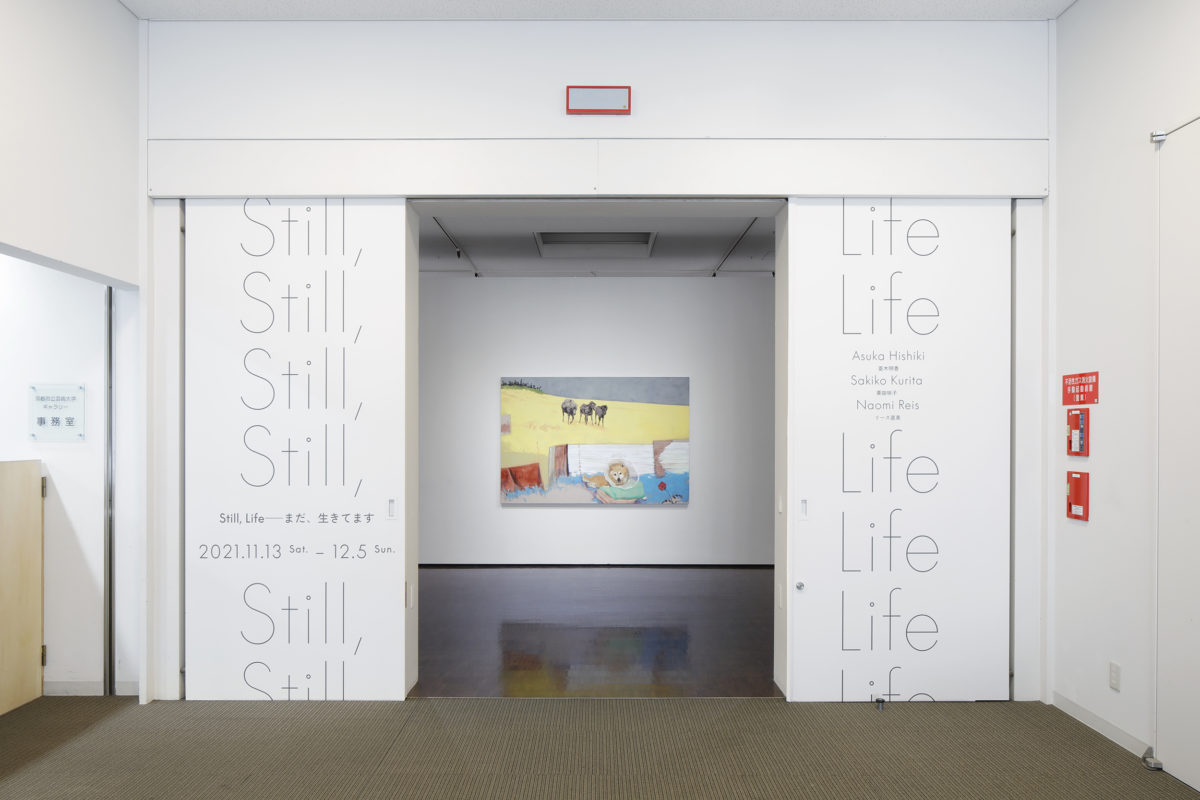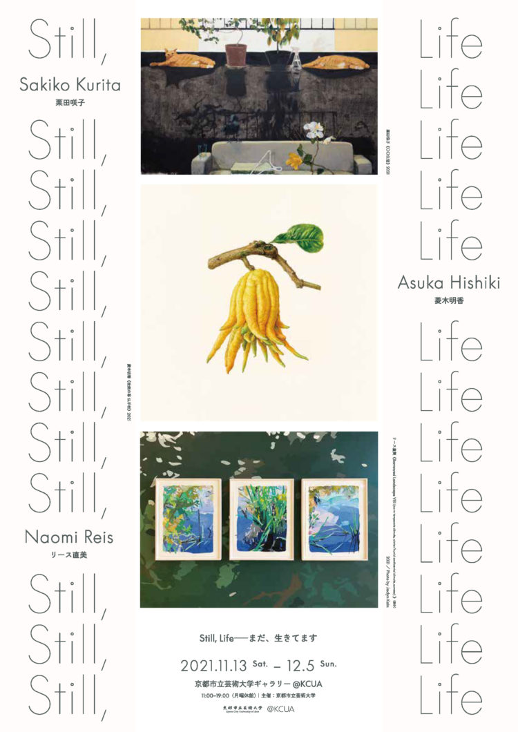 静物画=still life、またその間にコンマを入れて“Still, life”とすると「まだ、そこに命がある」「まだ、生きている」という意味に転じます。このたった一つの小さな記号が、言葉の意味を大きく変える力を持っているのです。日常的なものを起点として広がる世界を描く3人の作家、栗田咲子、菱木明香、リース直美によって企画された本展では、こうした言葉遊びを手がかりとして、何気なく通り過ぎていく日常の中にある「生」とは何かを考えるアーティストのまなざしが示されます。誰もが日々目にしているようなありふれた場面で、少し視点を変えて物事を見つめてみると、世界が大きく違って見えてくる。そんなマジックが起きる瞬間を鑑賞者と共有するためのスイッチが、そこには仕掛けられています。