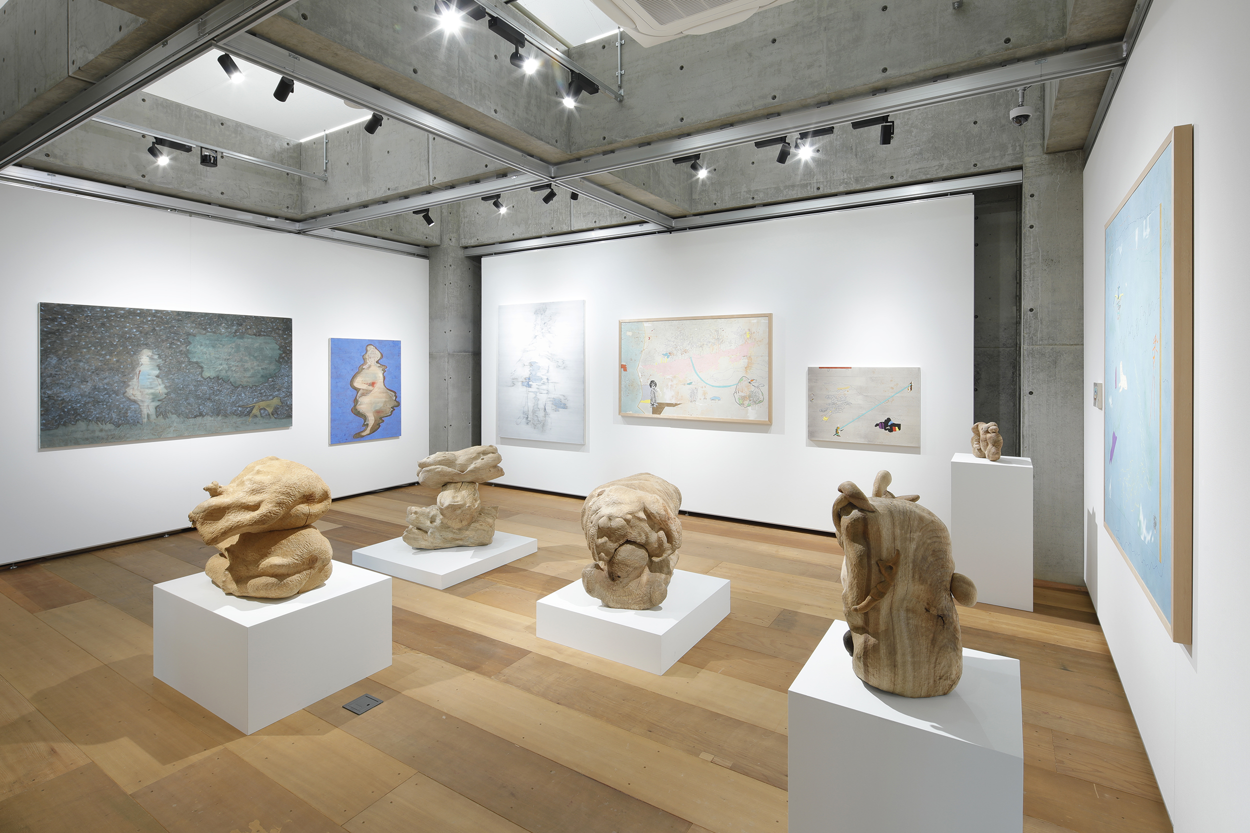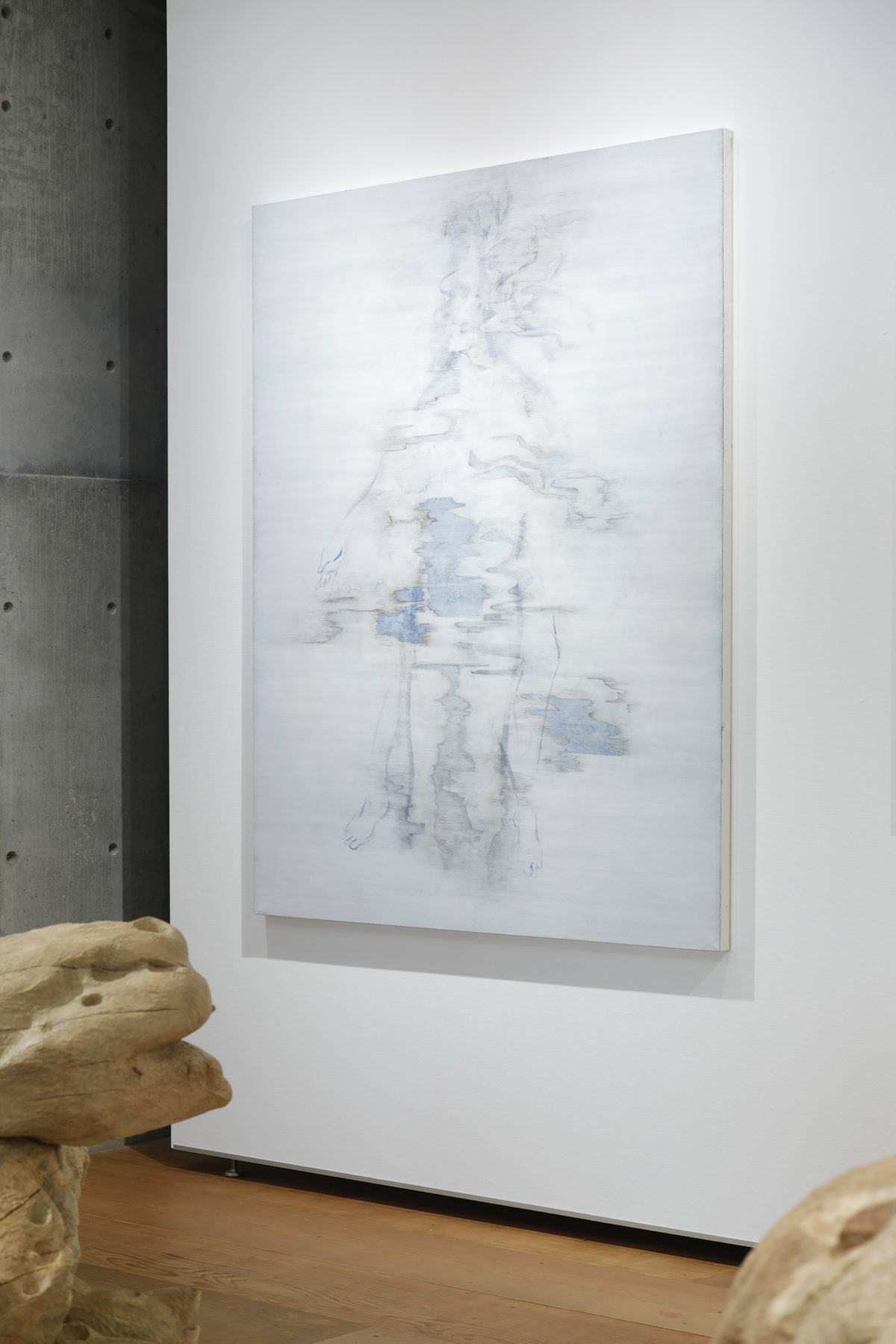 森夕香は、湿度や温度、風、音などのその時々の環境と、身体とのゆらぐ関係性を自らの経験を手掛かりにして描き出します。自分の外側の世界に接する皮膚、目、耳が感じ取ってきたいくつもの情報に影響を受けて身体の内部が変化していく様子が、互いに溶けゆくような、境界のあいまいな図像に表現されています。これは森だけの特別な体験ではなく、日常の中で誰にでも起こり得るけれど、たとえばカメラでは記録することができないような、不可視でつかみどころのない現象です。それらに有機的なかたちを与える森の筆づかいは非常に動的かつ軽やかで、絵画というフォーマットでありながら、視覚偏重の世の中に生きる私たちの、視覚以外の感覚をも呼び覚ますのです。