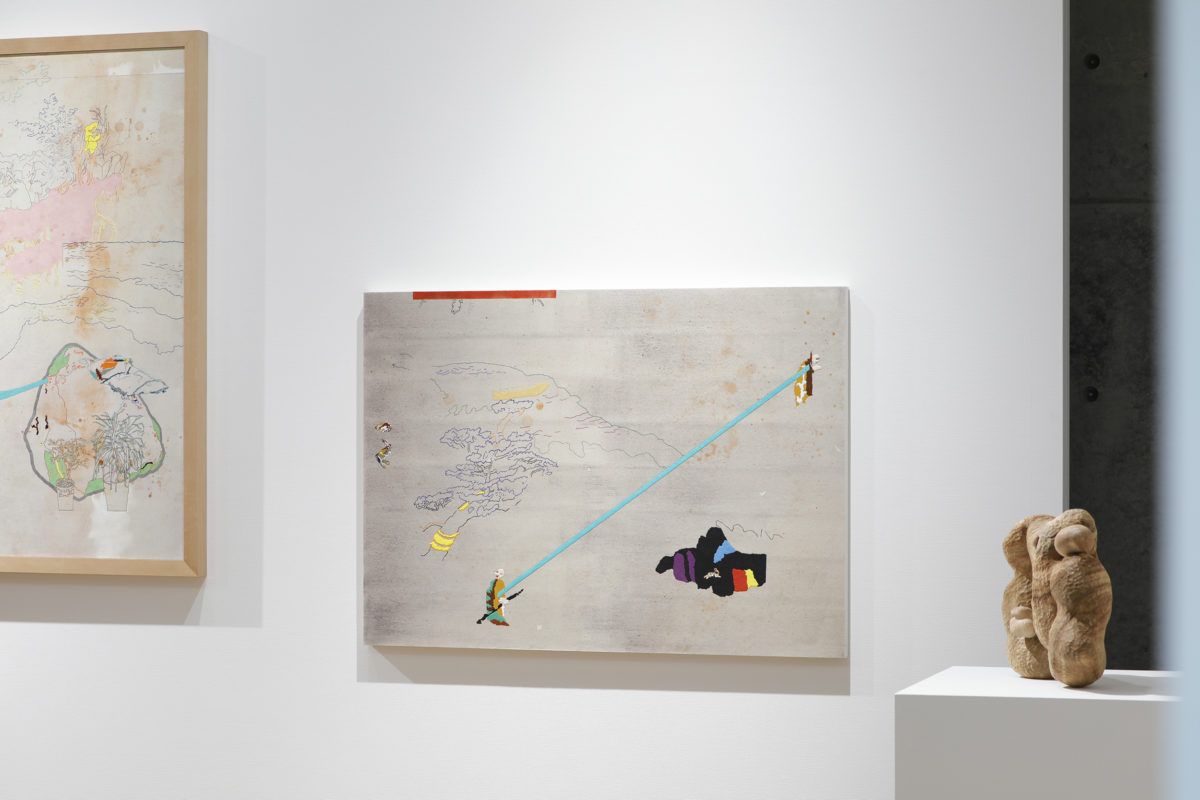 大槻拓矢は、写生や模写で得たかたちを丁寧な筆致で画面に転写して配置しながら、絵画とは何かを考察する作品を制作しています。写生のモチーフとなるのは、大槻が日々過ごすなかで出会う、誰もが目にしたことがあるかもしれない事物の数々です。写すという行為の繰り返しを通してごくシンプルなかたちとなったそれらは、柔らかな色彩を纏い、本画のパーツとして機能します。それらの断片は互いに繋がりを持つようで持たないままに、ときにはある方向に流れるように、あるいはどこへも向かわずに漂って、特定の物語を示すことなく画面の中に存在しています。その様子は頭に浮かんでは消えていくとりとめのない物事のありさまにもどこか似て、画面を眺めているうちに鑑賞者自身の中でぷっつりと途切れていた記憶と繋がって何らかのストーリーに結びつくのは、ある意味で必然と言えるかもしれません。