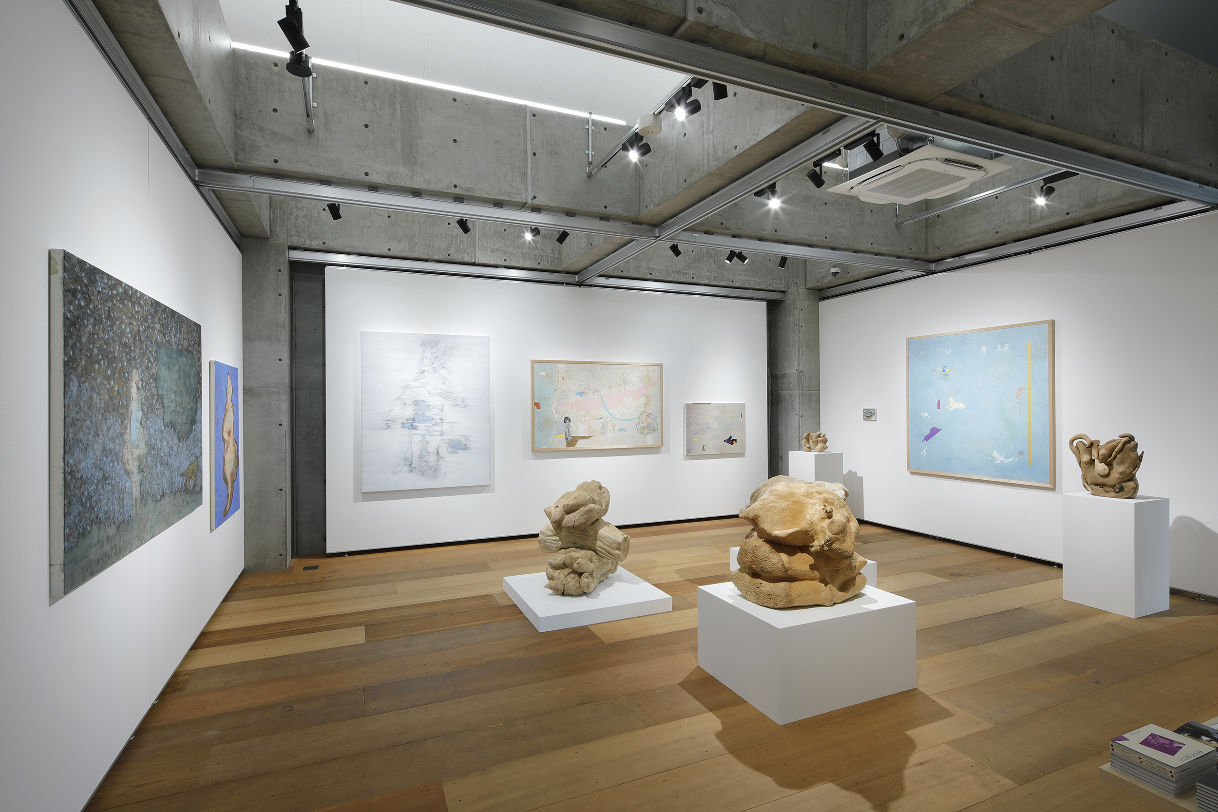 森夕香は、湿度や温度、風、音などのその時々の環境と、身体とのゆらぐ関係性を自らの経験を手掛かりにして描き出します。自分の外側の世界に接する皮膚、目、耳が感じ取ってきたいくつもの情報に影響を受けて身体の内部が変化していく様子が、互いに溶けゆくような、境界のあいまいな図像に表現されています。これは森だけの特別な体験ではなく、日常の中で誰にでも起こり得るけれど、たとえばカメラでは記録することができないような、不可視でつかみどころのない現象です。それらに有機的なかたちを与える森の筆づかいは非常に動的かつ軽やかで、絵画というフォーマットでありながら、視覚偏重の世の中に生きる私たちの、視覚以外の感覚をも呼び覚ますのです。