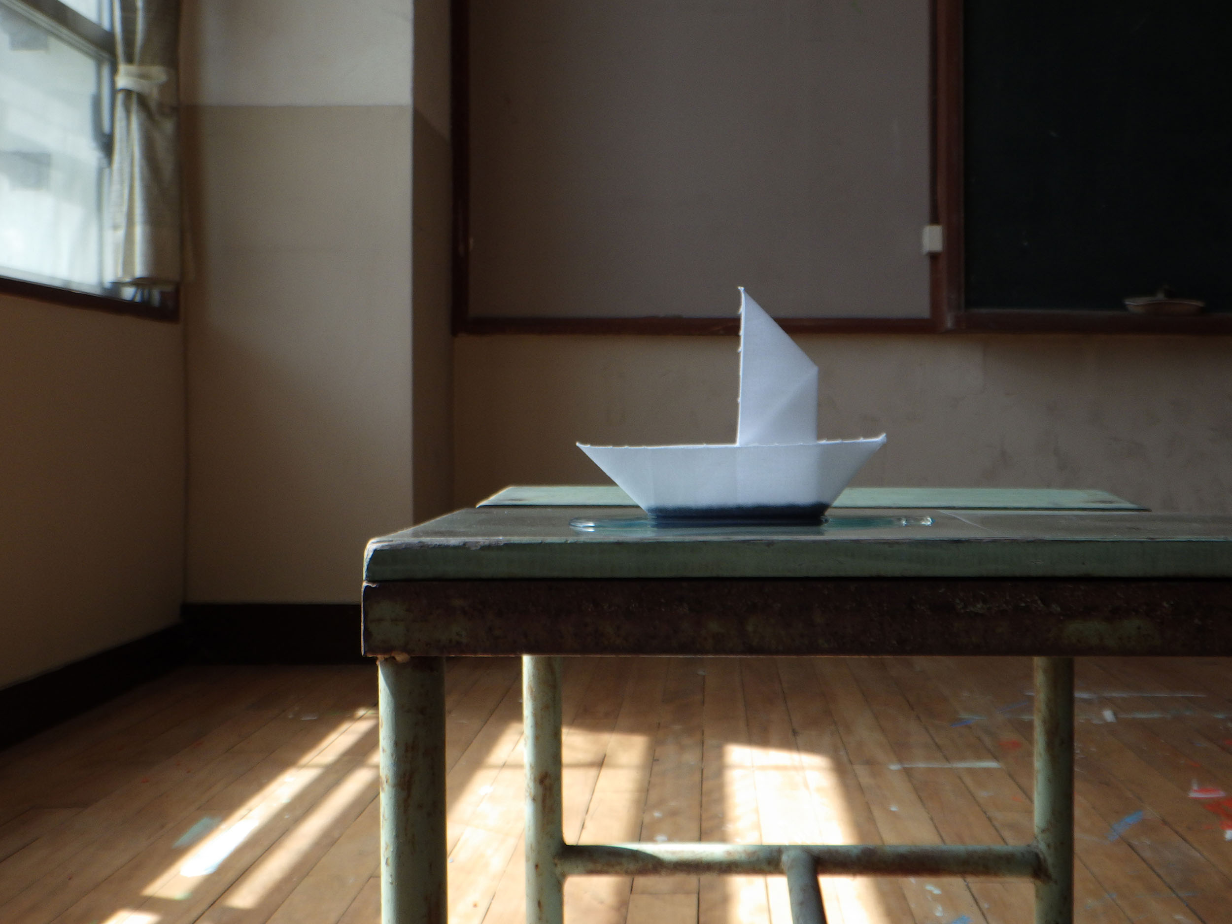 本展では、当時むらたが元崇仁小学校の校舎で記録した写真や映像を用いて制作した作品群を展示します。一つは、生地の裏面に捺染(プリント)した写真の像を、部分的に水で浸透させて表面ににじませることで図像が表れてくる《thickness of time》のシリーズです。乾いた状態で表側から水を滲ませることで少しずつ柔らかなイメージが立ち上がってくるさまは、断片的な記憶を紐解くうちにいくつかの物事がつながって鮮やかさが蘇るときの、頭のなかのイメージの動きのようでもあります。その様子は制作時にしか見ることはできませんが、そうした記憶を辿るかのような現象の痕跡もまた、鑑賞者の感覚に何かを語りかけることでしょう。もう一つのシリーズ、《planet》は、白い布を折ってできた舟が染料で少しずつ染まっていく様子を撮影したものです。映像と、舟であった白い布のいずれにも、閉校した小学校の活動の歴史が刻み込まれた静かな空間に流れる時間が緩やかに描かれています。