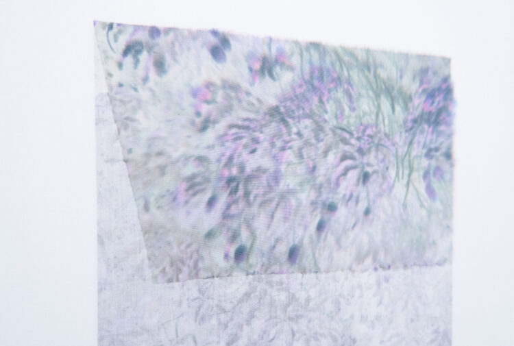 布に淡い色の染料を滲ませ、染まっていく時間を刻むむらたの作品を、記憶のなかにある輪郭のおぼろげなイメージになぞらえてみると、作品の題材となった特定の空間と時間から浮かび上がり、鑑賞者それぞれがもつ何かの記憶にも重なり合うかもしれません。目で見ている作品のイメージと、頭のなかのイメージが溶け合うことは、むらたが染色によって表現するものの、もう一つの体験のかたちとなることでしょう。