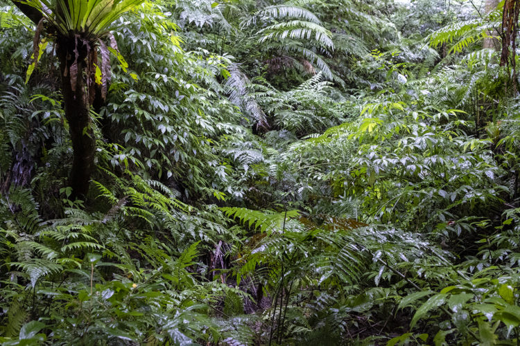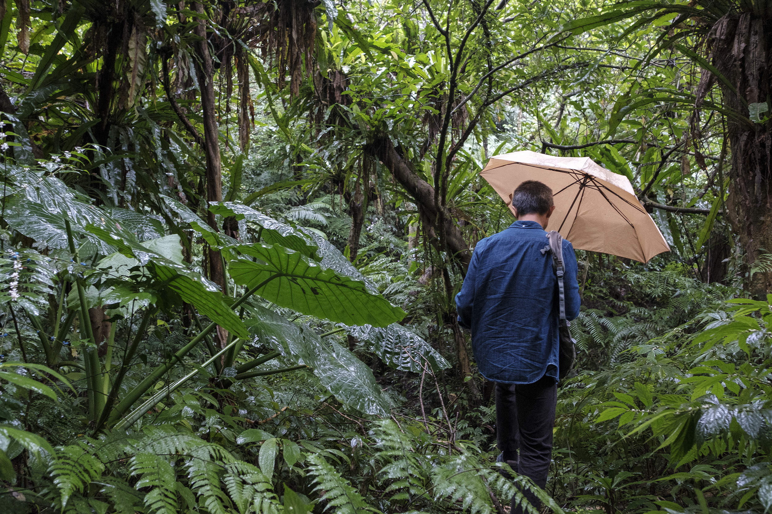 「このシダの森では、一年を通して風景はそれほど変わらない。作品ごとに季節を変えて撮影すると、音だけが違って聞こえることになるんだ」とジェンは言った。私はしばらく傘をさすのを止めて、耳を澄ましながらあたりを見渡した。森に降るやわらかな雨が奏でる響きは心地よく、葉から水滴が滴り落ちる様はとても美しかった。