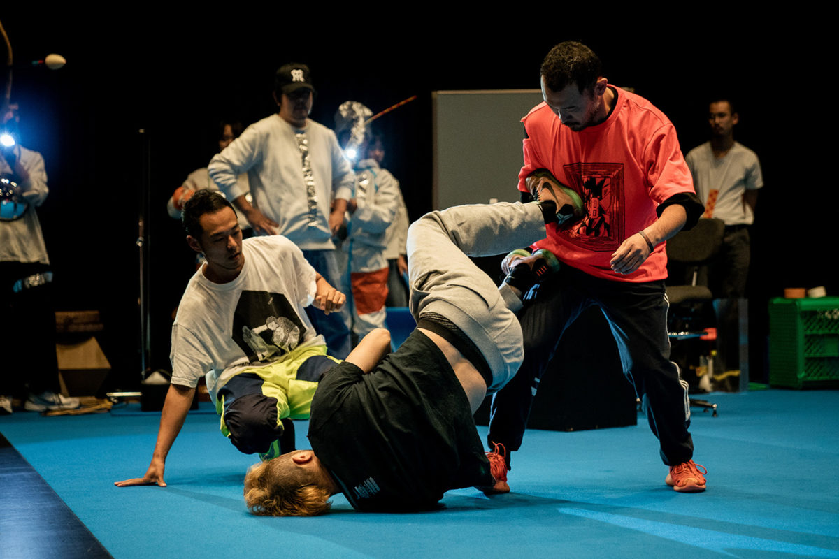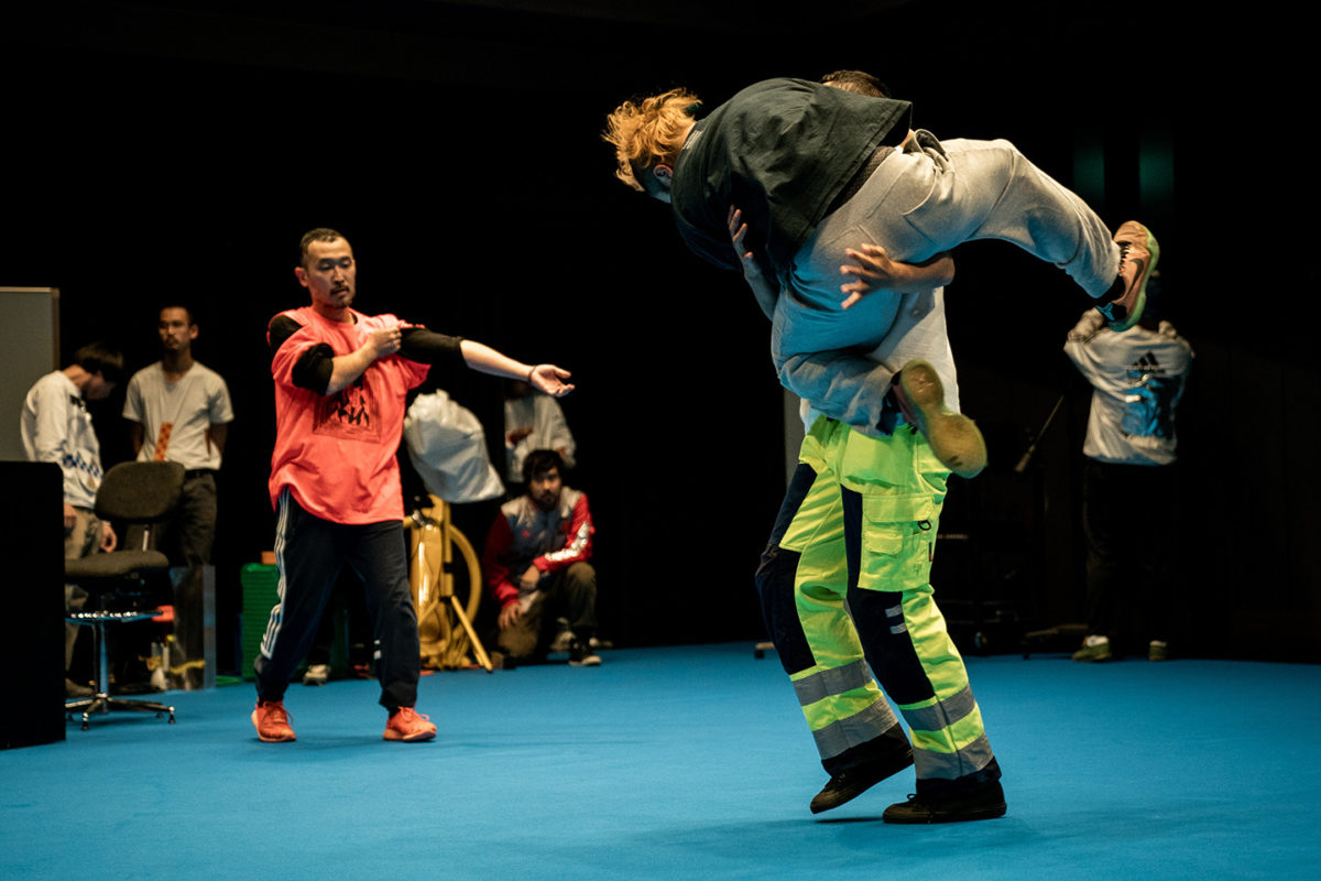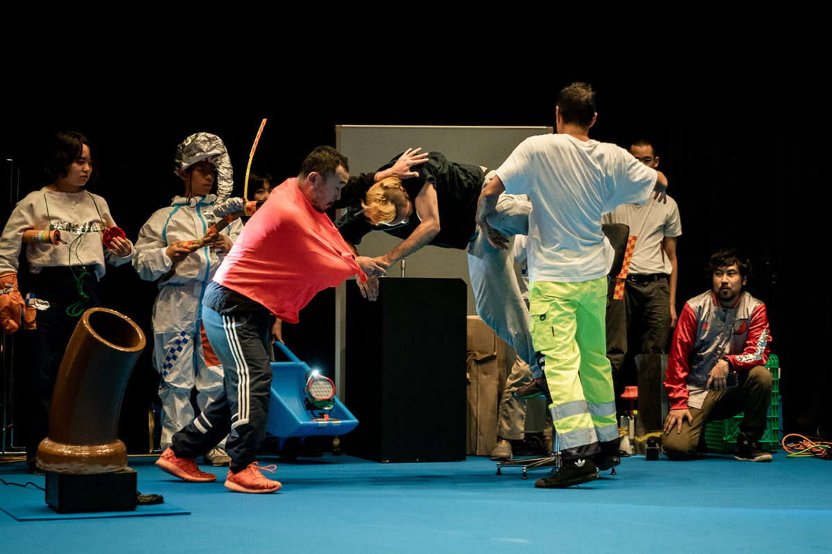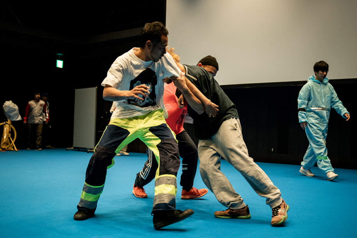 パフォーマンスの始まり、contact Gonzoの3人、金氏徹平と20人近くの学生らが、ステージの周りにバラバラと登場する。そして中央の空いた空間をつかって、contact Gonzoによるパフォーマンスが始まる。身体が衝突する音、漏れる声、間合い、動きなどを観客は追っていく。