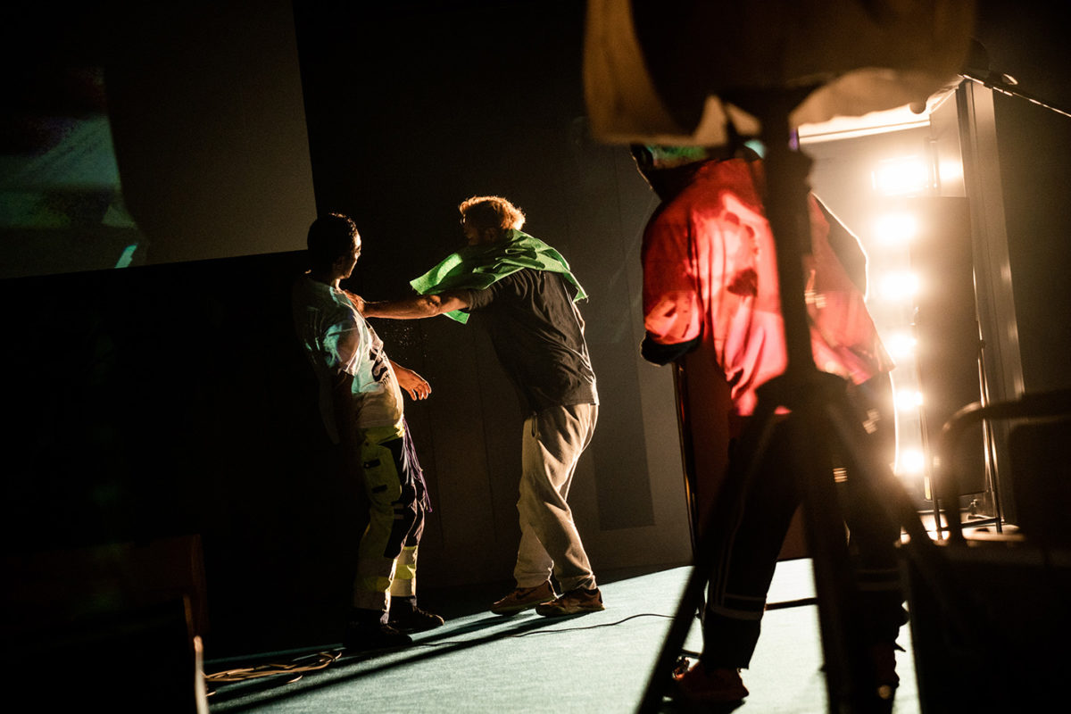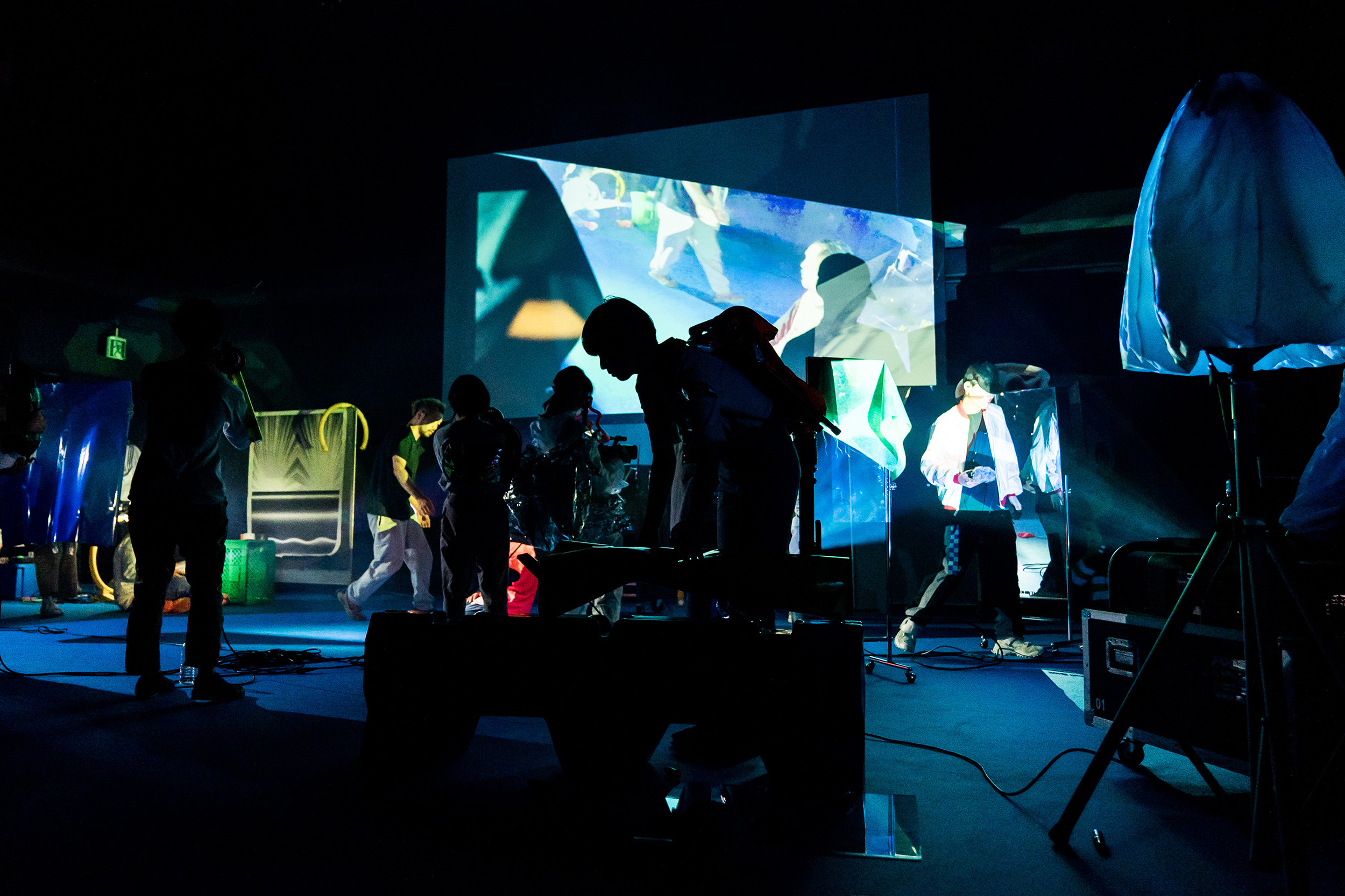 いつの間にか金氏らがつくりあげた空間を、contact Gonzoの方が逆に縫うような形で、接触せずに動いていく。その様子を、金氏らの誰かが手にしているビデオカメラでリアルタイムに撮り、その映像をまた別の誰かがそのままどこかに投影する。天井から垂れ下がるスクリーンや壁に、複数のアングルが次々映し出される。ステージで繰り広げられているそれら全てが、捉えられ記録され公開されているようでいて、観客である私たちはその全体を掴みきれない。なぜなら、全体を見ているはずの観客席からの視線は、そこに行き着くまでに分散される。カメラやプロジェクター、鏡、ステージ上の人間の複数の視点が交錯・変化していくことで、観客の視線は全く別の場所に遭遇したりする。