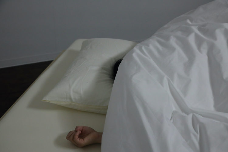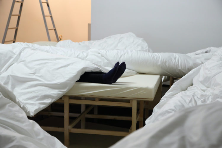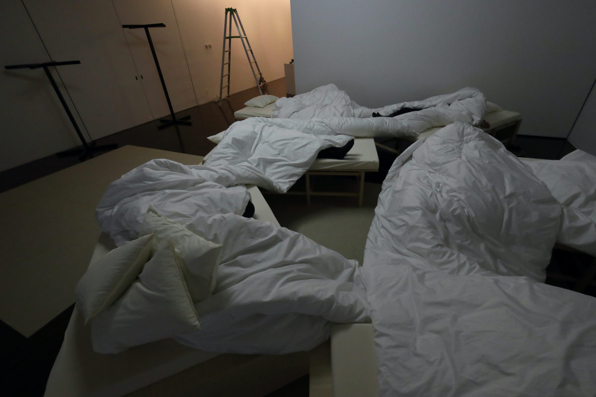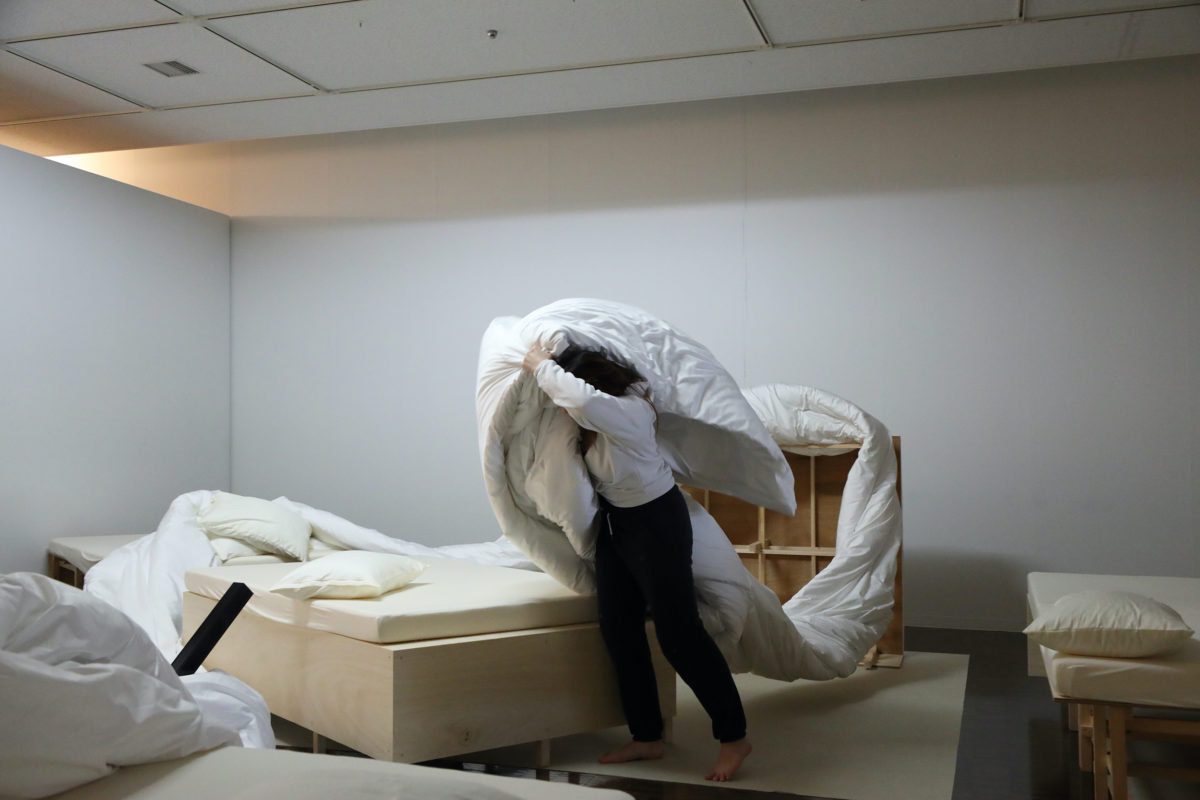 睡眠は私的でありながら、意識の外に落ちていくという意味で私的な行為ではありえない。休息のための眠りは私にとっての不安であり、知らされた眠りは、知られていることをどこかで諦めていく。会期中、私を含めた数十人によるパフォーマンスを行う。「10人で同時に眠る」「身体を疲れさせる」「恋人と2人で眠る」「女性の集まり」「位置」「ひかり」「視線」「安心感」「夢への影響」など、日によって参加する人数や性別、ものの位置などが変わっていく、合計18日間のパフォーマンスを会期中の土日祝日に実施する。パフォーマーはいかなる状況の中でもただひたすら“眠る”ことを目的にそれぞれ動く。