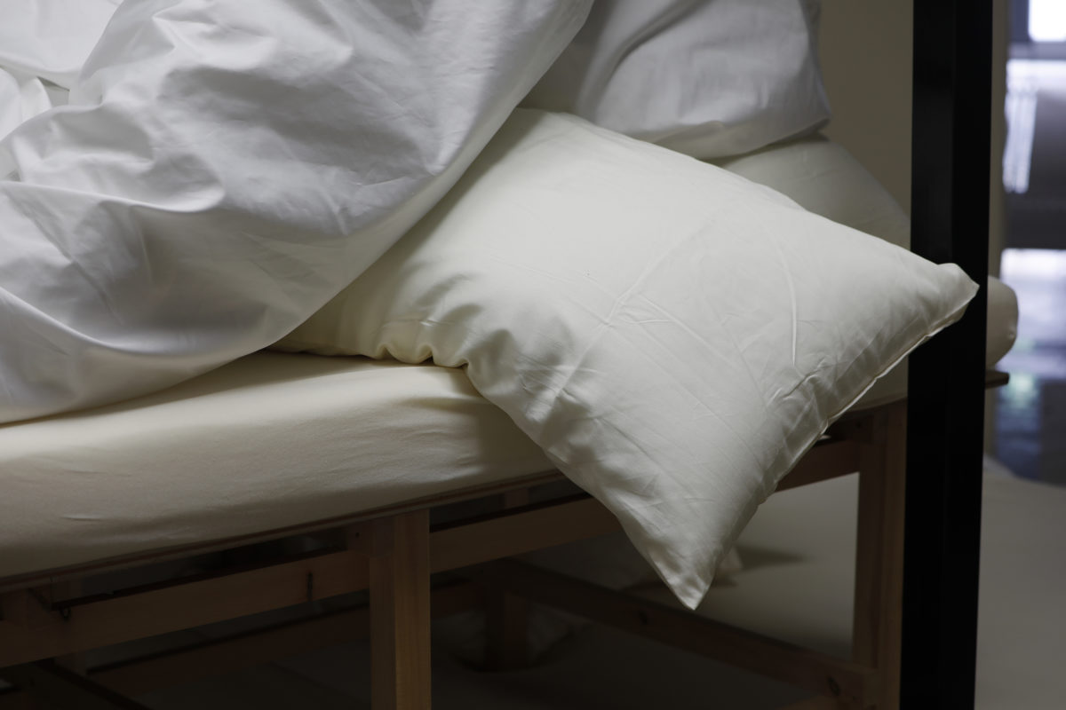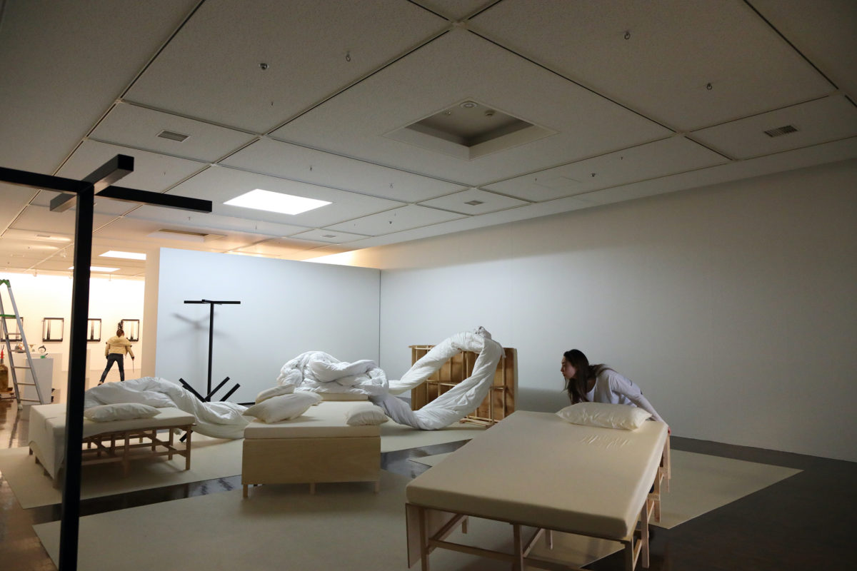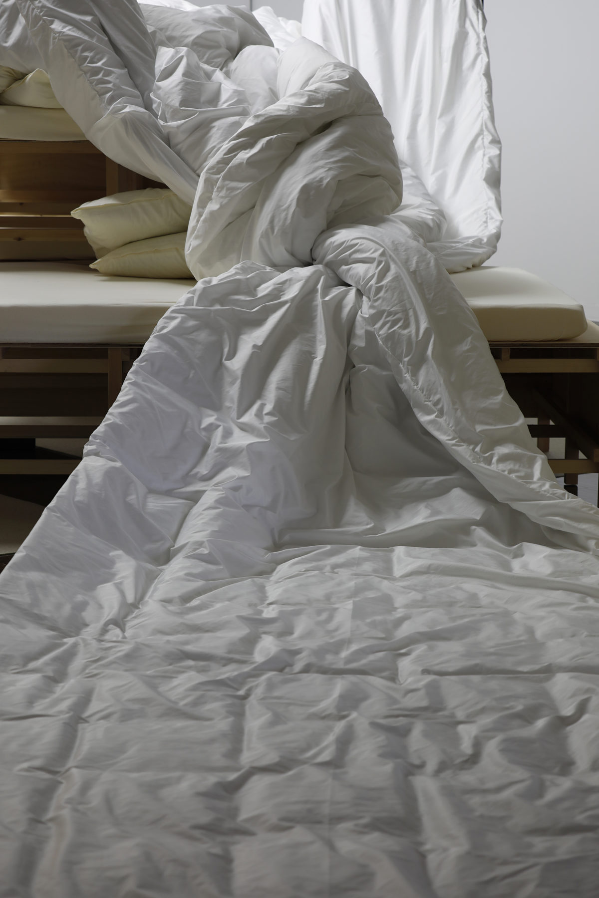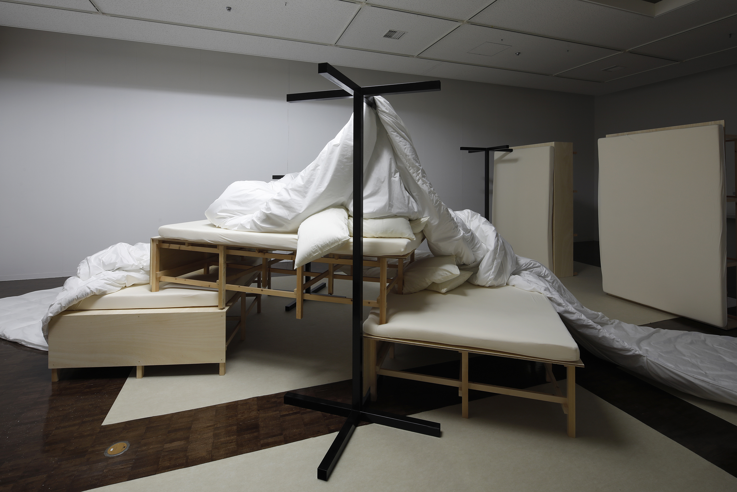 宮木:行為の痕跡として展示しています。パフォーマンスによって生じたベッドのわずかな窪みや、枕元に落ちている髪の毛1本を手がかりに、そこにはいない人の気配を想像することができます。装置のレイアウトはパフォーマンスの時々に、行為に集中するための配置へと変化します。目を閉じた状態で感じる周りの光量や色、目を開いた時に映る情報、布団の肌触りなどに気を配りながら、心地の良いものと悪いものを取り入れて配置を決めます。装置を見ることから作品全体を想像してもらうのも良いし、造形的に構成されたものなのかなとか、自由に見てもらえたら嬉しいです。「どう見たら良いか」と尋ねられることがありますが、こちらが感じていることと、見る人が感じることがぴったり合わさってはいけないとも思っています。むしろ色々な見方へ広く展開できる方法について考えています。鑑賞者の個人のことに少しでも紐づくことがあればと思います。