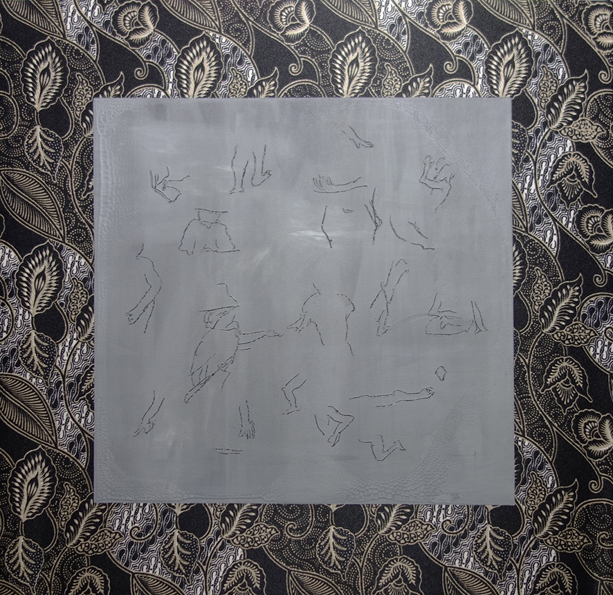 インドネシアのアーティストの多くは、社会との関わりを制作のベースにしています。自分がいままで作ってきた作品にも広い意味での社会性はあったと思うのですが、もっといまの感じを表現するにはどうすれば良いかを考えていました。それには何か違うものが必要だと感じて、まずはインドネシアで特徴的な版画のコースで勉強することにしました。以前の作品では最後に全体を湿らせることによって絵を動かしていたのですが、版画の技法を使っても、それに似たような、ある種の偶然性というのか、自分以外の関わりの中でものを作りたいと思ったんですね。それで布の上にシルクスクリーンで刷って、そのインクが乾くまでの間に人のポーズ、例えば人が寝てる様子などを描いてみることにしました。インドネシアでは記号的な何かというよりも、例えば暑いだとか、辛いだとか、身体的な感覚を強く感じていたので、それを痕跡として残したかったんです、石や壁面に刻まれているような感じで。