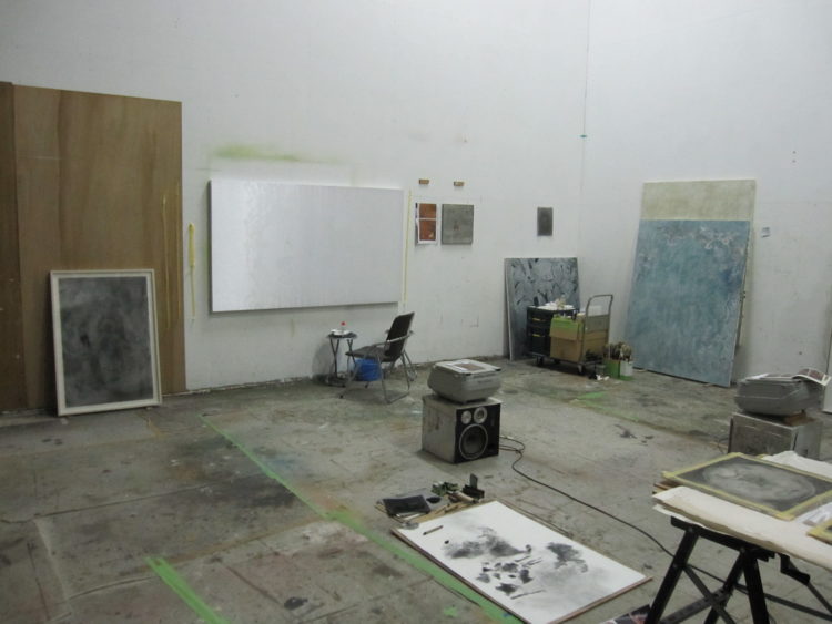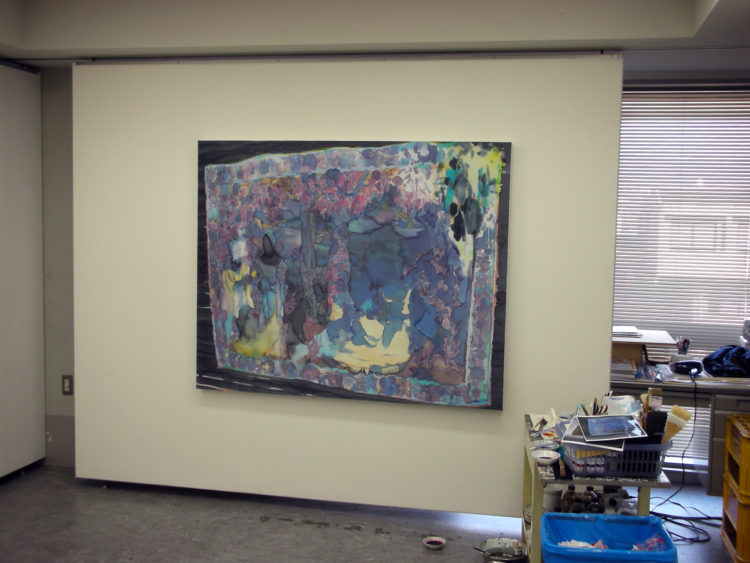 先生との関係もすごく良かったです。大人数の中での一学生という、武蔵美の時とは全然違った。大学院ではゼミで、宇佐美圭司さんをはじめとした先生方から学んだことで、美術の世界が広がっていったんです。宇佐美さんは博学というのか、研究者のようにではなくてアーティストとしての理解の仕方かもしれないけど、いろんなことに対して理解がある人でした。何より、話しているとやる気がでるんです、何かできそうだなと。よく、わかりきったことをやっても仕方がないというか、静止しているようなものを描いても仕方がないんだよって言っていました。宇佐美さんの言葉だと「シャゴシャゴしてる」。「けんちゃんの絵、シャゴシャゴしてるかな?」って聞いてくるんです。「シャゴシャゴかあ……」って(笑)。何かが泡立ってるっているか、定まった状態じゃなくて、何か認識や概念も動かされるような状態なんですよね。深沢軍治さんからはすごく素材のことを教わりましたね。いま、紙にインディゴを使って描いていますけど、紙を使うという発想は深沢さんからの影響があると思います。深沢さんって、いつも新しいことに取り組んで悩んでいるんですよね。そして、ひとりの制作者として感じている悩みや考えを学生にも話す。いつもいろんな素材を探求していたのを覚えています。