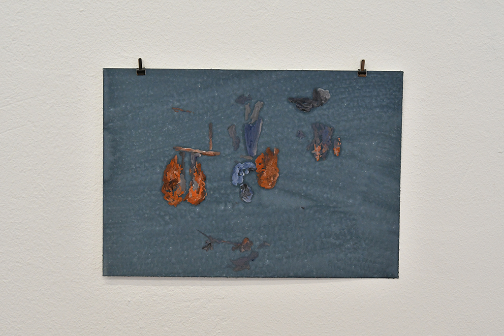 2018年くらいからインディゴのペーストを使うようになりました。最初は今のような形ではなく、絵具に混ぜたりして使っていました。インディゴはインドネシアのローカルな農作物でもありつつ、植民地時代の強制栽培作物として輸出されていたという歴史もあります。藍は世界中にあるので、さまざまな関連性が引き寄せられもする。それに、藍のペーストのザラザラした風合いや、手でガーッと擦れば、手触りを残しつつフラットにできる感じが、前に使っていた西洋絵画の下地、白亜地にすごく似ていたんですよね。成分に似たような石灰分があるのだと思います。自分の認識の中ではありますが、インドネシアのものでありつつ、西洋的なものにも似ているというのが、すごく両義的というか、そういうものとして扱えるということもあって、だんだんしっくり来たように思います。今は、人のふるまいをモチーフにしています。自分は環境に結構影響されるので、そこで目にする人のふるまいを描いている、という感じでしょうか。