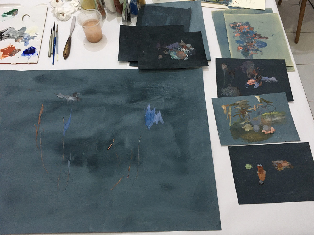 少し先の目標としては、司馬江漢が絹の上に自作の油絵具で描いたような、絹本油彩をやりたいと思っています。いまはサテン地の作品と、インディゴの作品を作っていますが。常に自分は、ちょっと違うタイプの作品を並行して手がけているんですが、それらをどこかでクロスさせられるのかどうか、みたいなことをいつも考えています。実は以前にちょっと絹本油彩をやったのですが、まだ少し早いかなと思ってやめていて。だから紙の上にインディゴとテンペラで描いてるんだけど、司馬江漢の作品みたいなのっぺりした独特の質感というか、感覚として変な、ちぐはぐな感じのものを作りたいなと思っているんですよ。それはずっと変わりませんね。