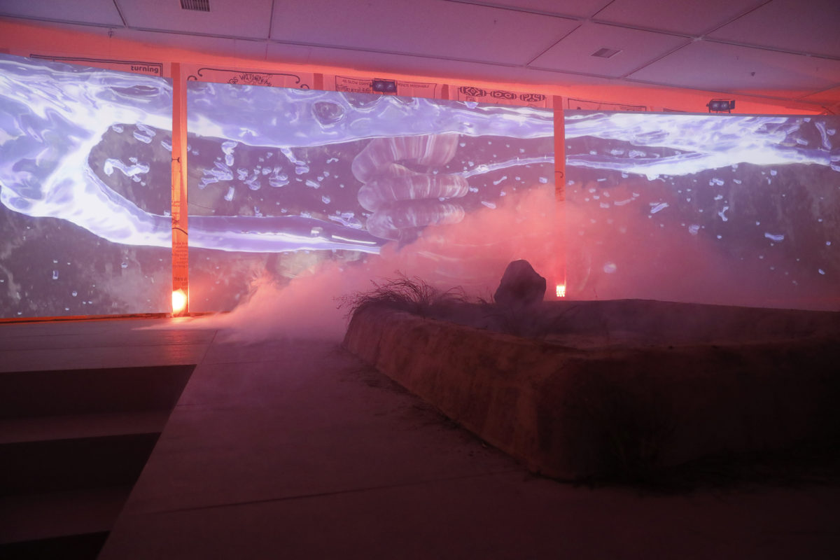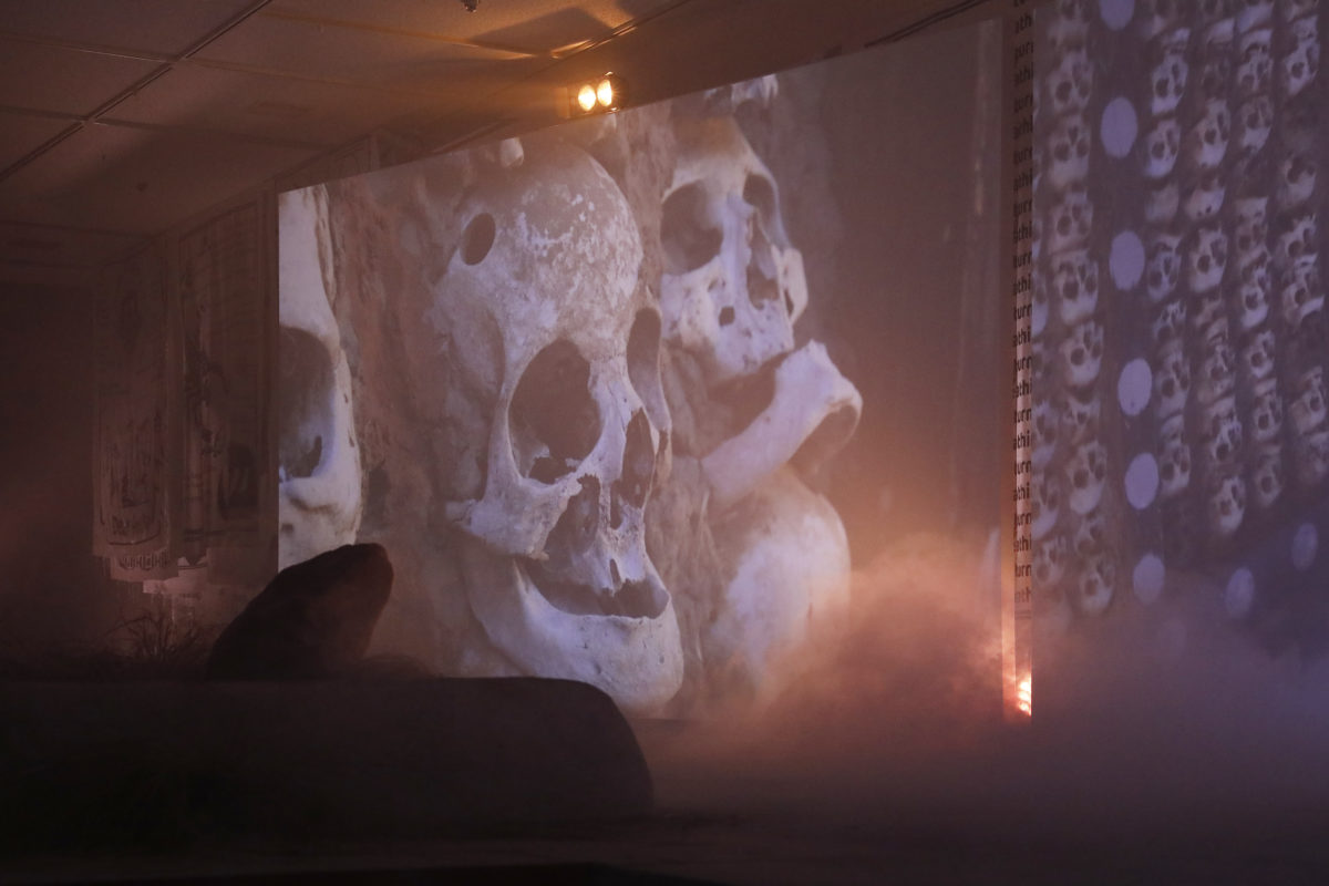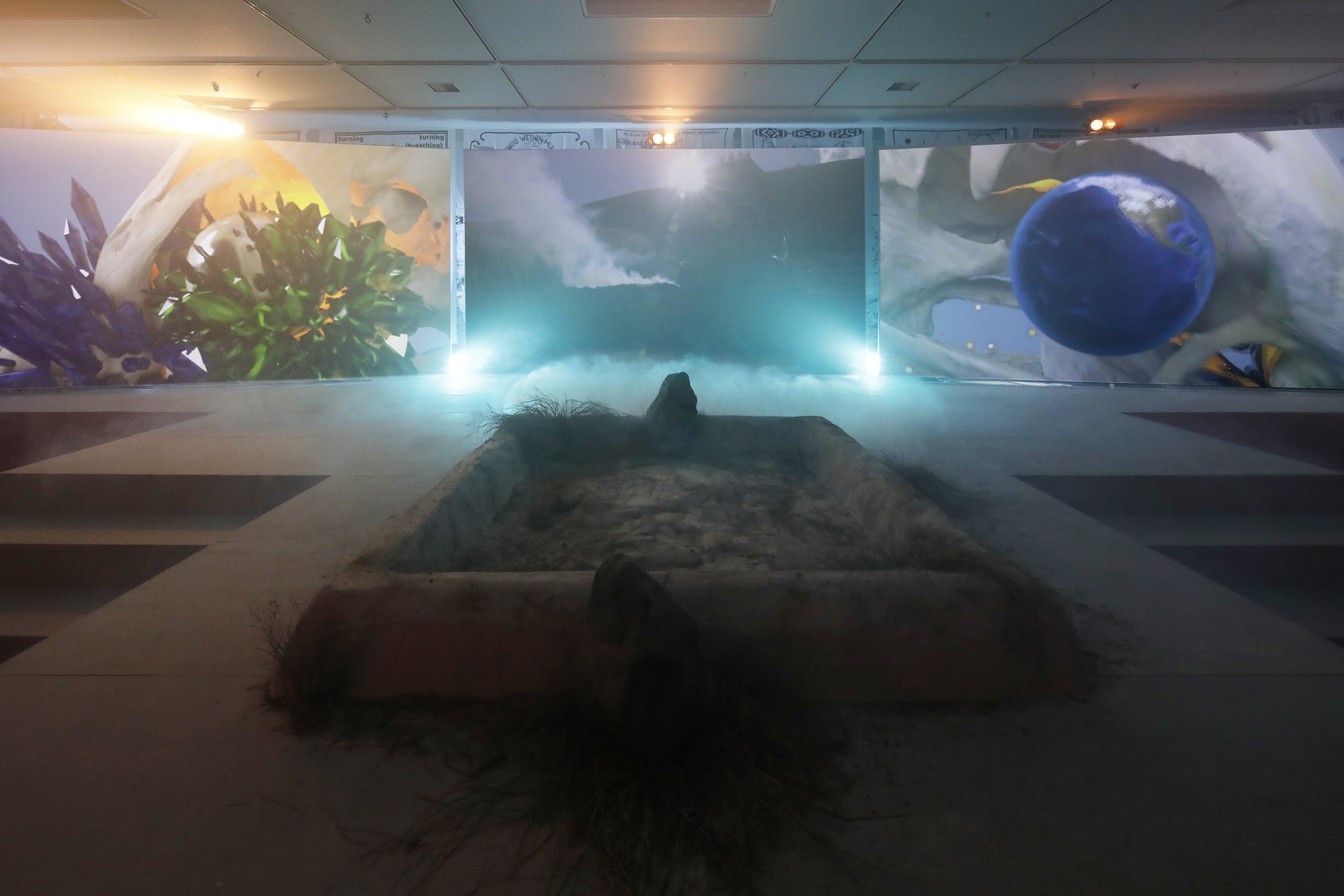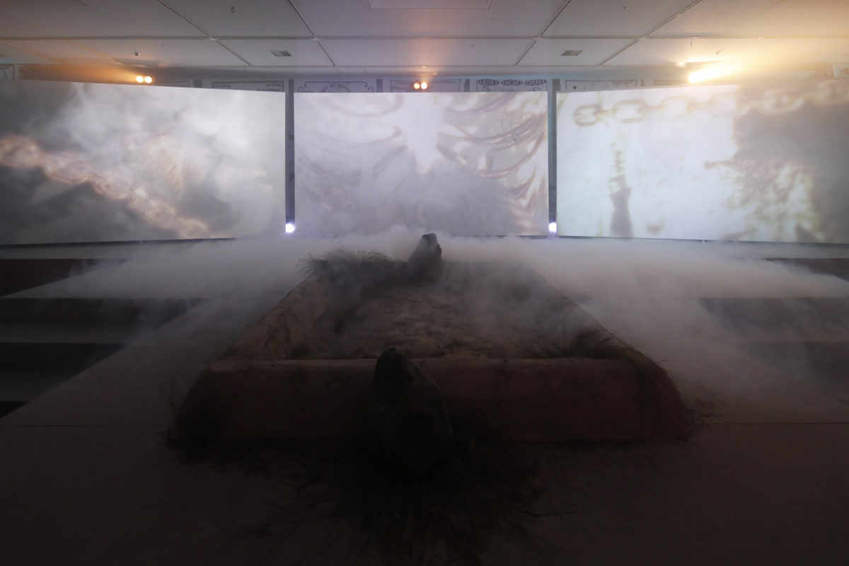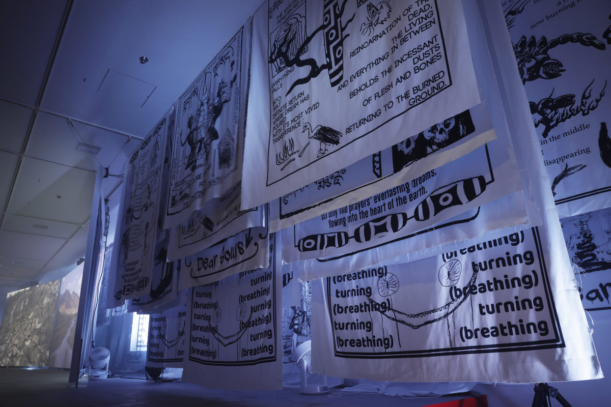 高山を流れ行く雲か、漂い来る護摩の煙か、縹渺たる霧に充ちた部屋には、風ではためくタルチョ(祈祷旗)を模した布がたくさん吊られている。その一枚一枚の布のなかで、観自在菩薩やパドマサンバヴァ[6]の真言などを表すチベット文字に宝珠や仏塔といった図像[7]と、英語の文章や矢印の記号や現代的なイラストとが混在する有様は、宗教的伝統と現代アートとのシンクレティズムを感じさせる。部屋の中央に設えられた三面鏡のような巨大スクリーンの映像には、観自在菩薩の真言が彫られたマニ石、積み上げられた頭蓋骨、鳥葬場らしき場所などが現れ、死んでは生まれ変わることを繰り返す輪廻の世界に観る者を誘っているかのようだ。