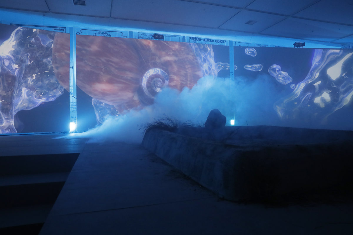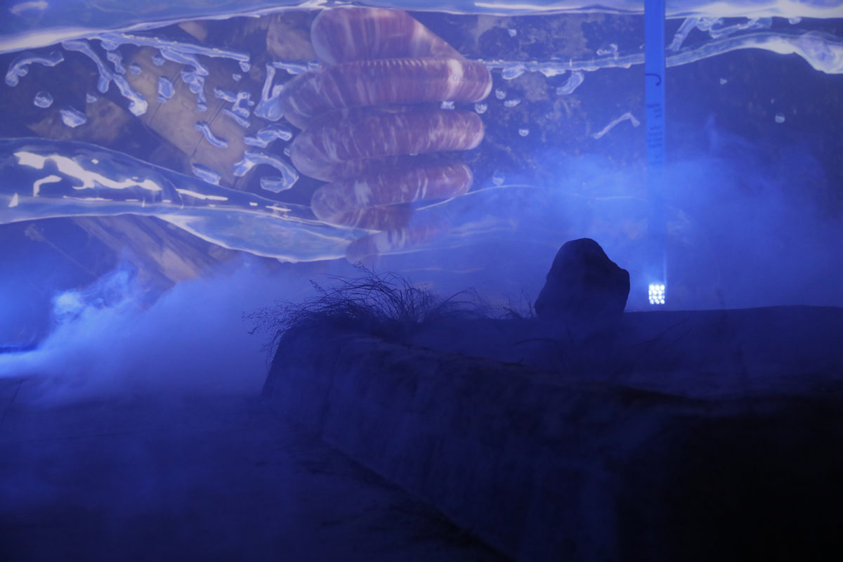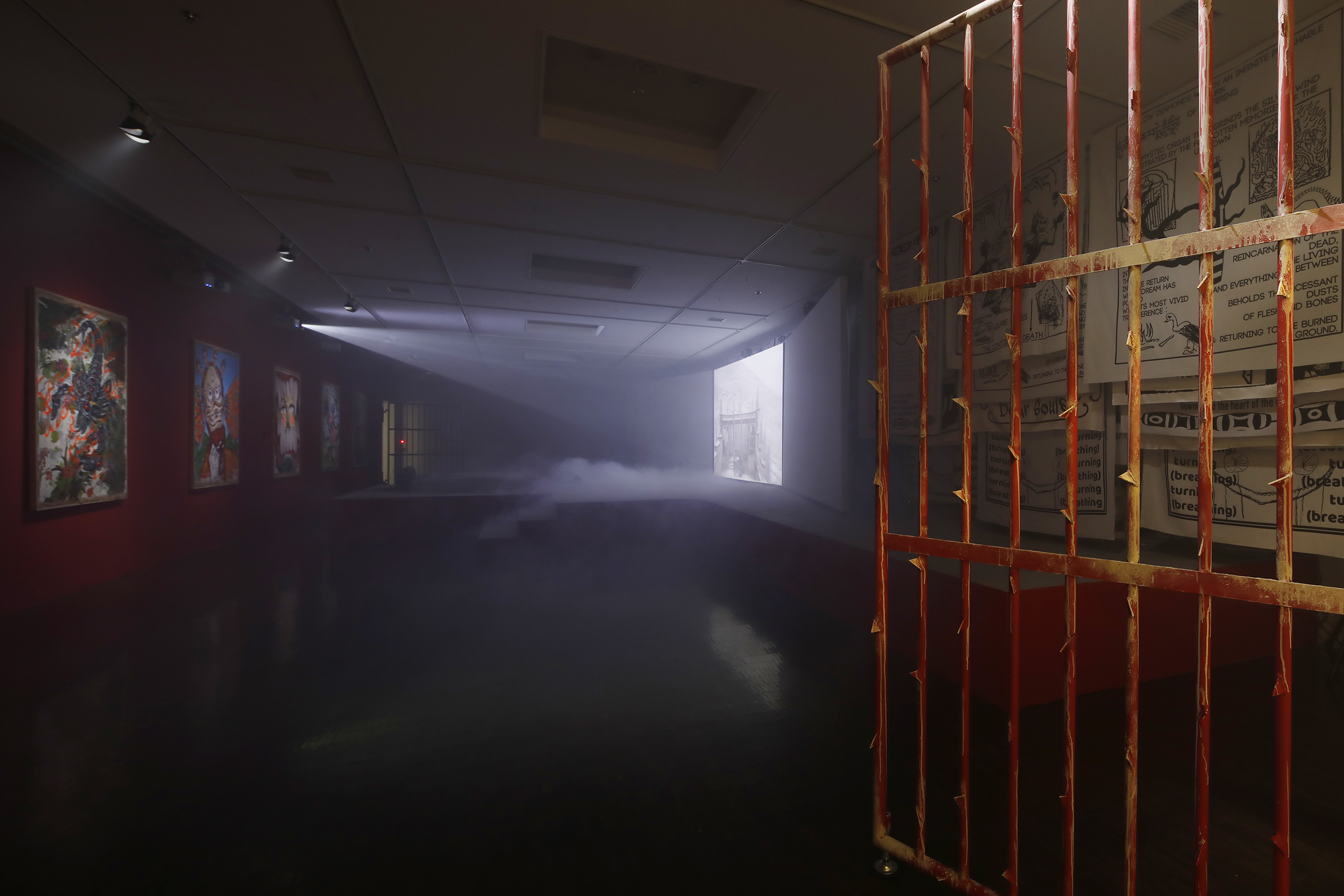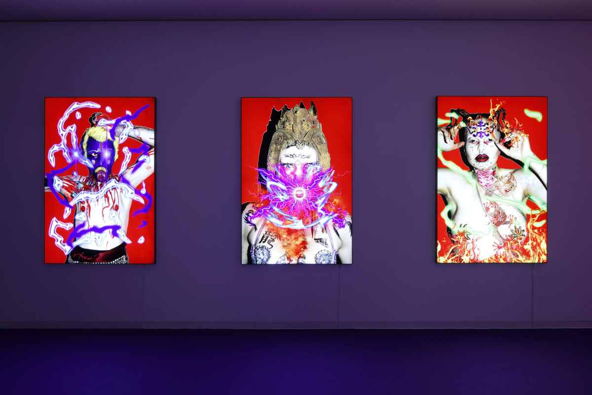 本展のタイトルである「牧羊人」(ムーヤンレン)は、中国語で「羊飼い」を意味し、多くの宗教において「失われた魂の探究」を意味するメタファーであり、転じて精神的変容の出発点を象徴します。チベット系仏教の信者であり、現代のクラブカルチャーにも精通するチェンの手によって、神秘的な宗教儀式とレイブパーティが混淆したような祝祭的空間が出現。