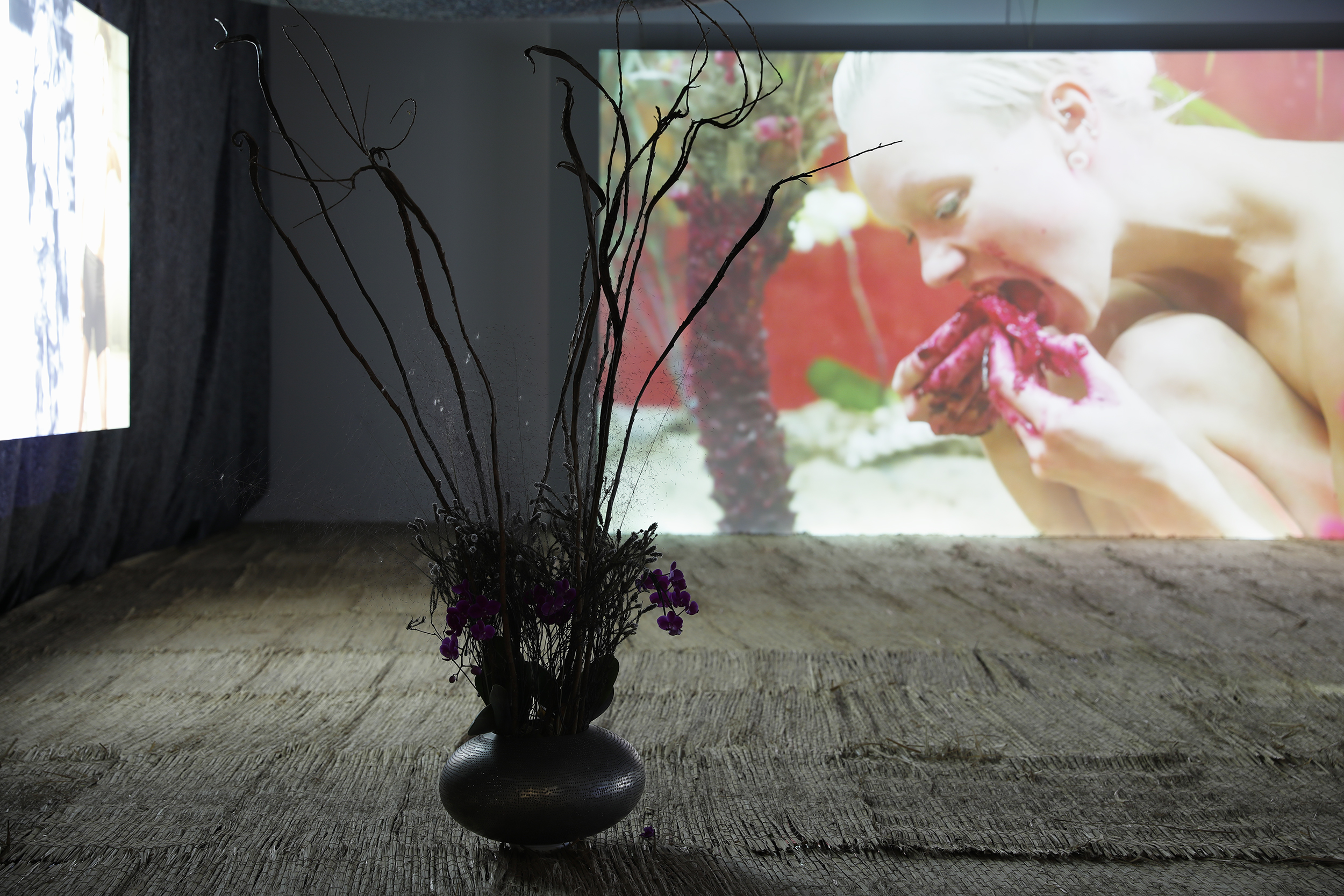 「自在なる者」を意味する《ISHVARA》は、ある種の灌頂[24]を受けずして観てはならないと思わせる戦慄すべきパフォーマンス映像だった。角を生やした異形の女性たちが乳房と陰毛を顕わにして踊り狂い、sattva(有情)の文字が記された白い台の上で両手を縛られて囚われた妙齢の女性の身体を撫でまわし嗅ぎまわし舐めまわし、イーシュヴァラ(Īśvara)の異名を持つヒンドゥー教の神シヴァを崇拝する修行者サドゥーの異端アゴーリ[25]を思わせる男性が灰を塗りたくったかのような身体から性器を顕わにして赤い粉の入った器に放尿し、その尿と赤い粉を混ぜ合わせた液体を目前の人物の頭頂に灌いで顔に塗りたくり、果てにはその真っ赤な液体を自分の舌でベロリと舐め、地面に横たわった死体を思わせる人物を踏みつけにする。そうして繰り広げられる不気味で思議を超えた魅惑的で畏るべき[26]世界の緊張が頂点に達した時、中央に卍を配した舞台の袖で巨柱に刻まれた「迷故三界城 悟故十方空」の文字が純白の光[27]を煌々と放つ。その光に照らされていると、ふと、泥中より出づる清浄な白蓮を想い、煩悩即菩提[28]について能々思量すべきことを想う。