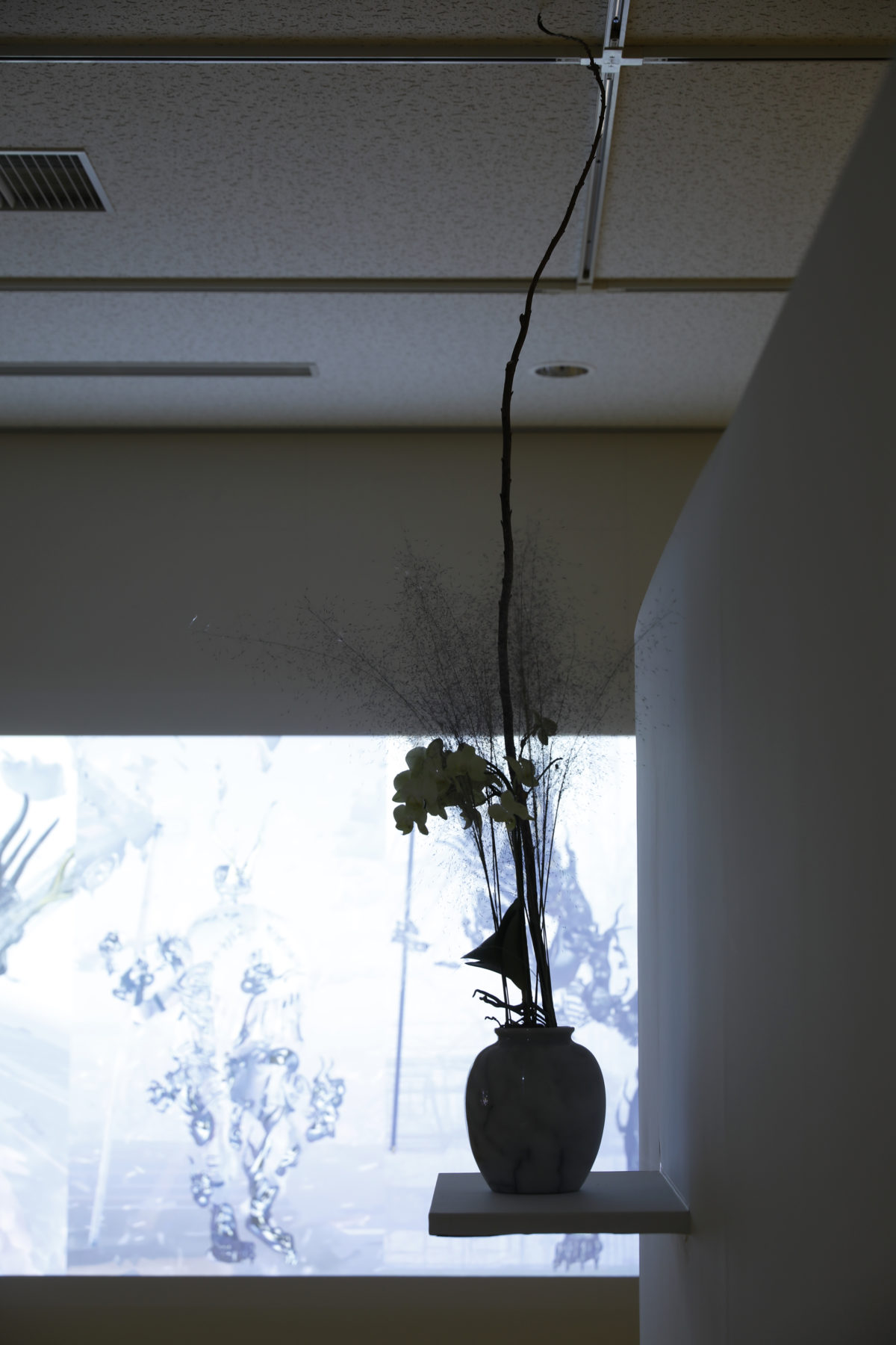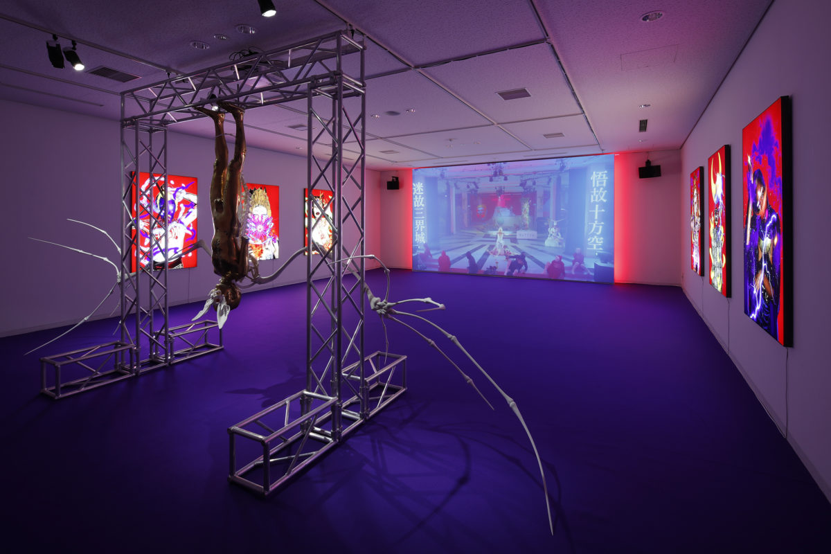 《EXO-Performance/Beio》は日本に生まれ育った筆者にとって印象深く親近感を覚える映像作品だった。空海と弥勒菩薩[15]を同じく表す梵字と「同行二人」[16]および「迷故三界城 悟故十方空 本来無東西 何処有南北」(迷うが故に三界[17]は城であり、悟るが故に十方[18]は空である。本来東西は無いのだから、どこに南北があろうか)[19]という文字が入った四国遍路の菅笠を被り、修行や布教などで遊行僧が各地を巡り歩く際に用いる錫杖を手にした人物が、モーションキャプチャを介してコンピュータグラフィックスで描かれた金色の角を持つ厳めしい龍と、雷轟電撃なる嵐の中で重なり合う。そういえば、この展覧会が開かれているギャラリー@KCUAの目と鼻の先には神泉苑[20]があり、今は昔、旱魃による被害が甚だしかった天長元年(824)、淳和天皇の勅により、空海がそこで雨請いの法を修した際、天竺の阿耨達智池[21]から勧請されて金色の蛇の姿で現れた善如龍王[22]は、長谷川等伯[23]がそうしたように人と龍とが重なり合う像容で描かれることがある。『今昔物語集』などに記される神泉苑での雨請いによって空海が見事に降らせた雨は、約1200年の時を超えて目前のスクリーンに投影された映像と同じく疾風迅雷を伴ったのであろうかと、脳裏で交わる今と昔に思いを馳せる。