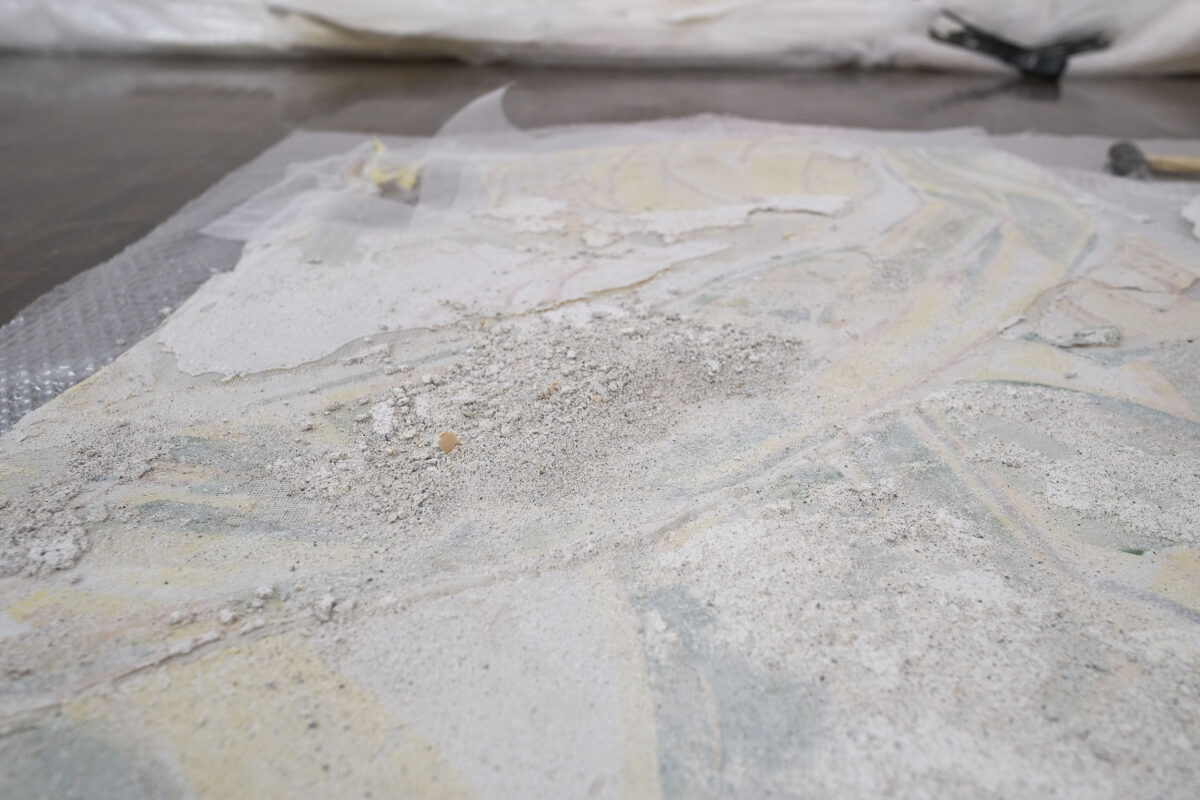まず、裏側の余分な漆喰を落としてから新しい支持体となる布の上にパーツを順に再配置し、裏打ち(裏面をよく伸ばしたのち非水溶性の接着剤を塗布して布地などに貼り付ける)が行われました。