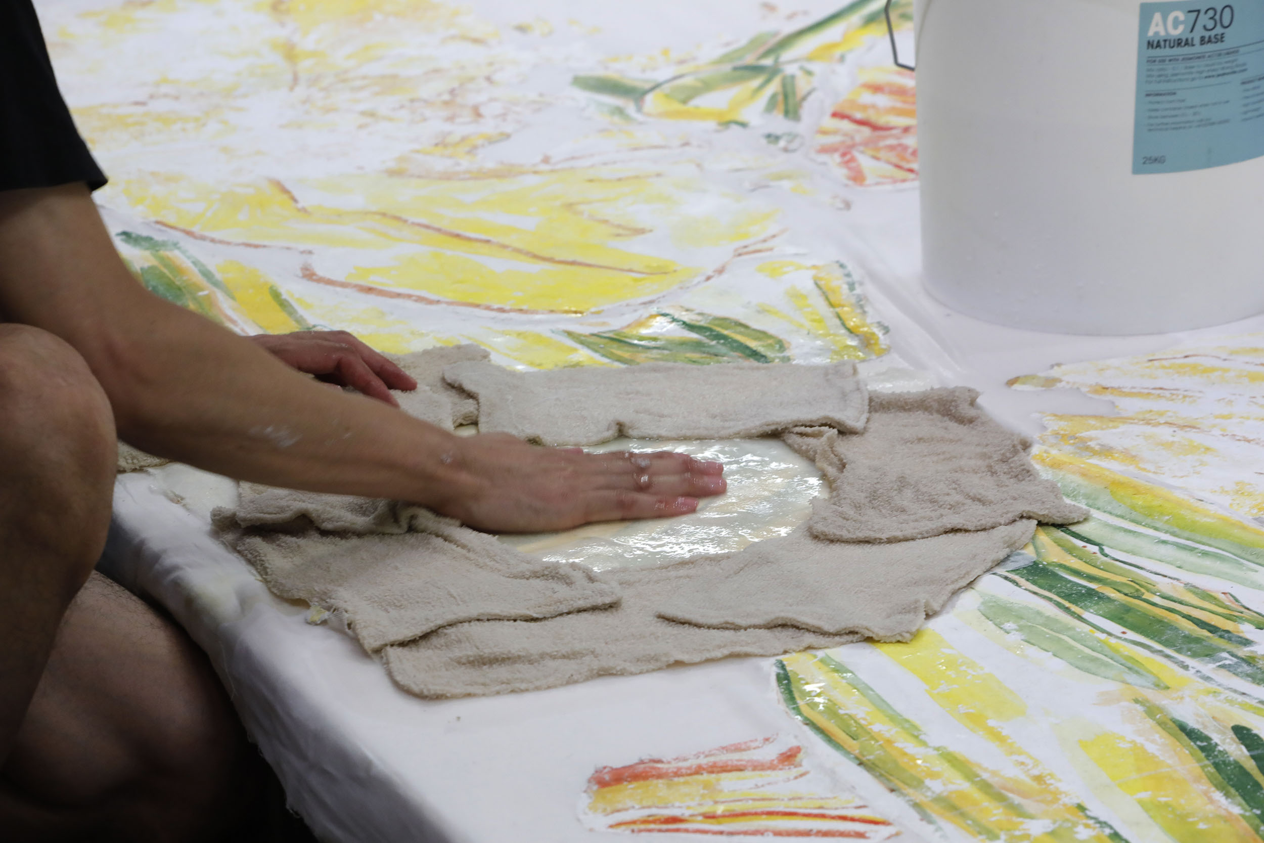 その後、お湯を含ませた布をかぶせて膠をふやかしながら、表打ち(表面に膠を塗り、寒冷紗などの布地を貼り付ける)を剥がしていきます。