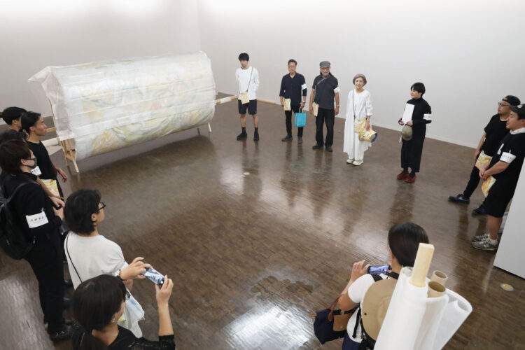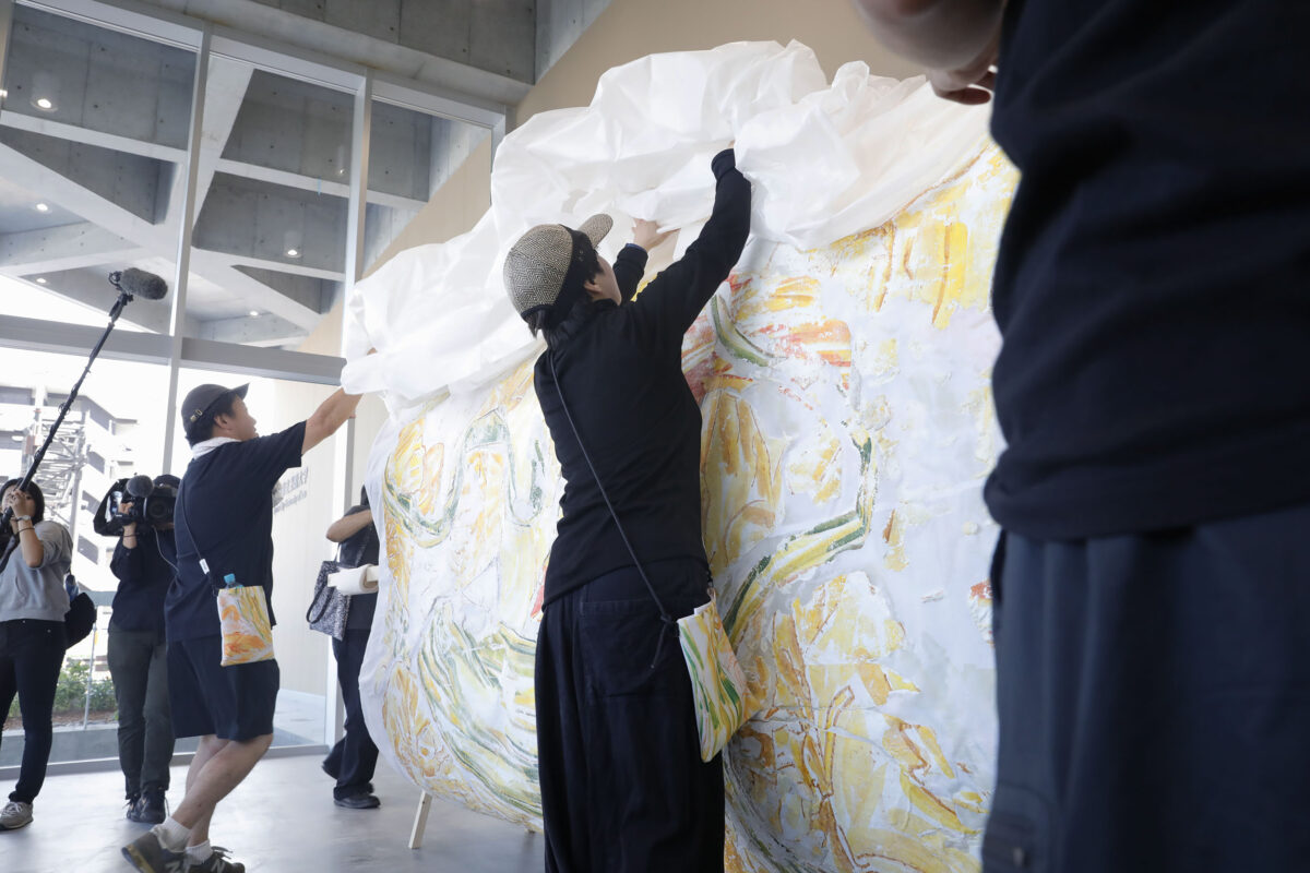 運ばれてきた壁画は、2023年10月1日(日)の式典の際にお披露目し、2023年10月3日(火)–11月12日(日)の会期で、「still moving final: うつしのまなざし 学長室壁画引越しプロジェクト(第2期)」として、@KCUA・芸術資料館共通エントランスにて展示を行いました。