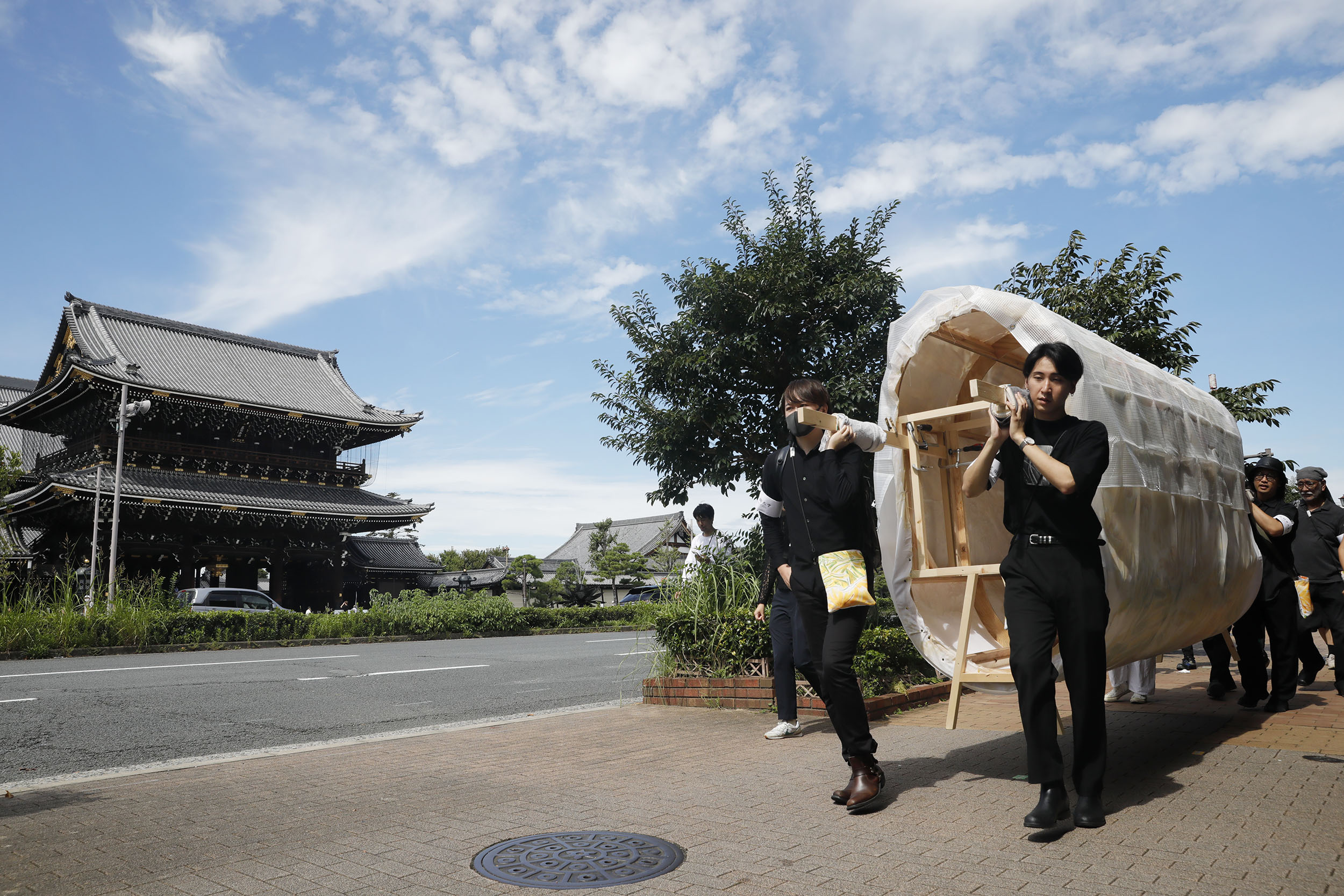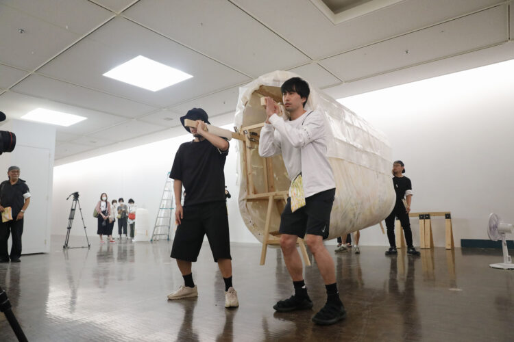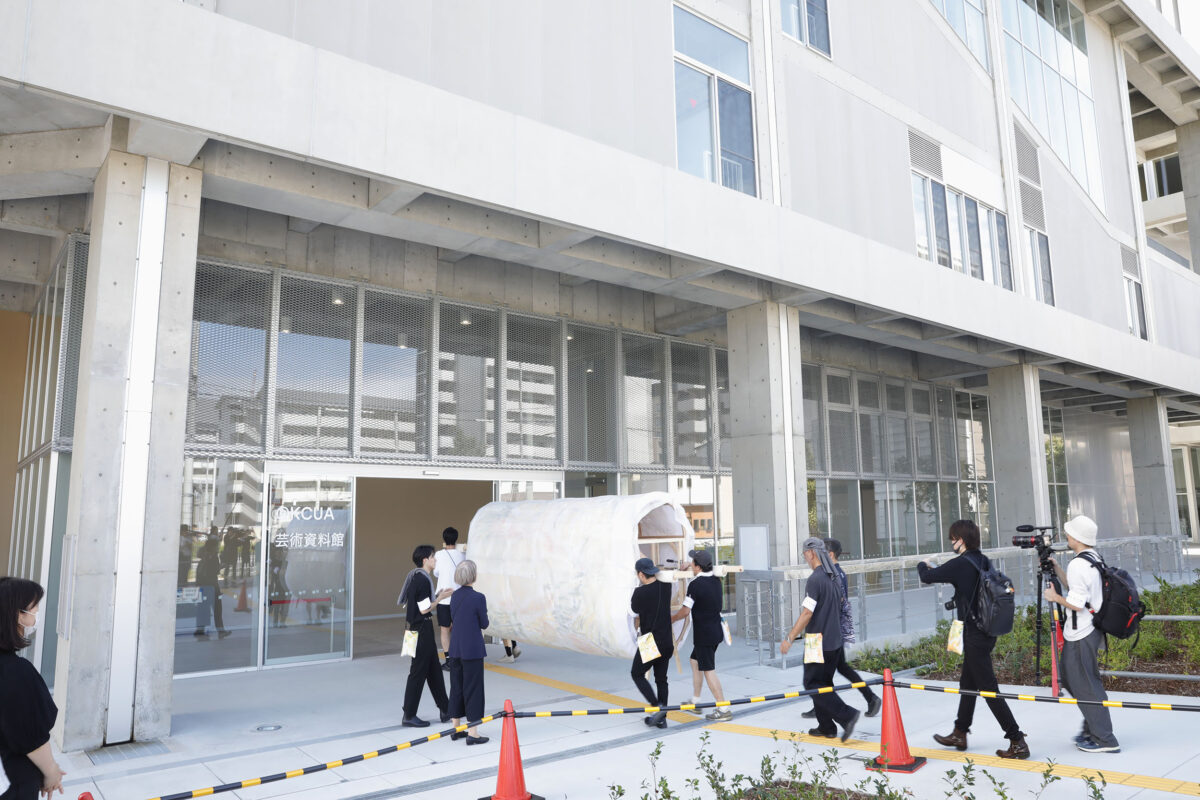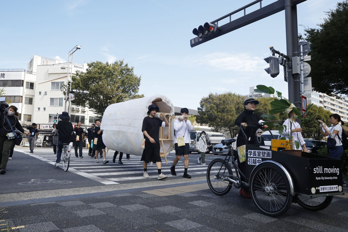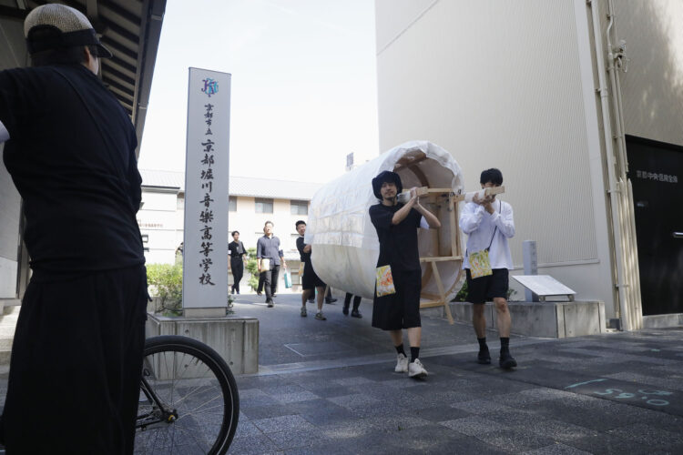 2023年9月25日(月)、旧@KCUAから新キャンパスまでの「引越し」の日を迎えました。壁画を楕円柱型の土台に巻き付け、4人で担げるようにセッティングをしました。また、警察署からは道路使用の許可証をいただきました。