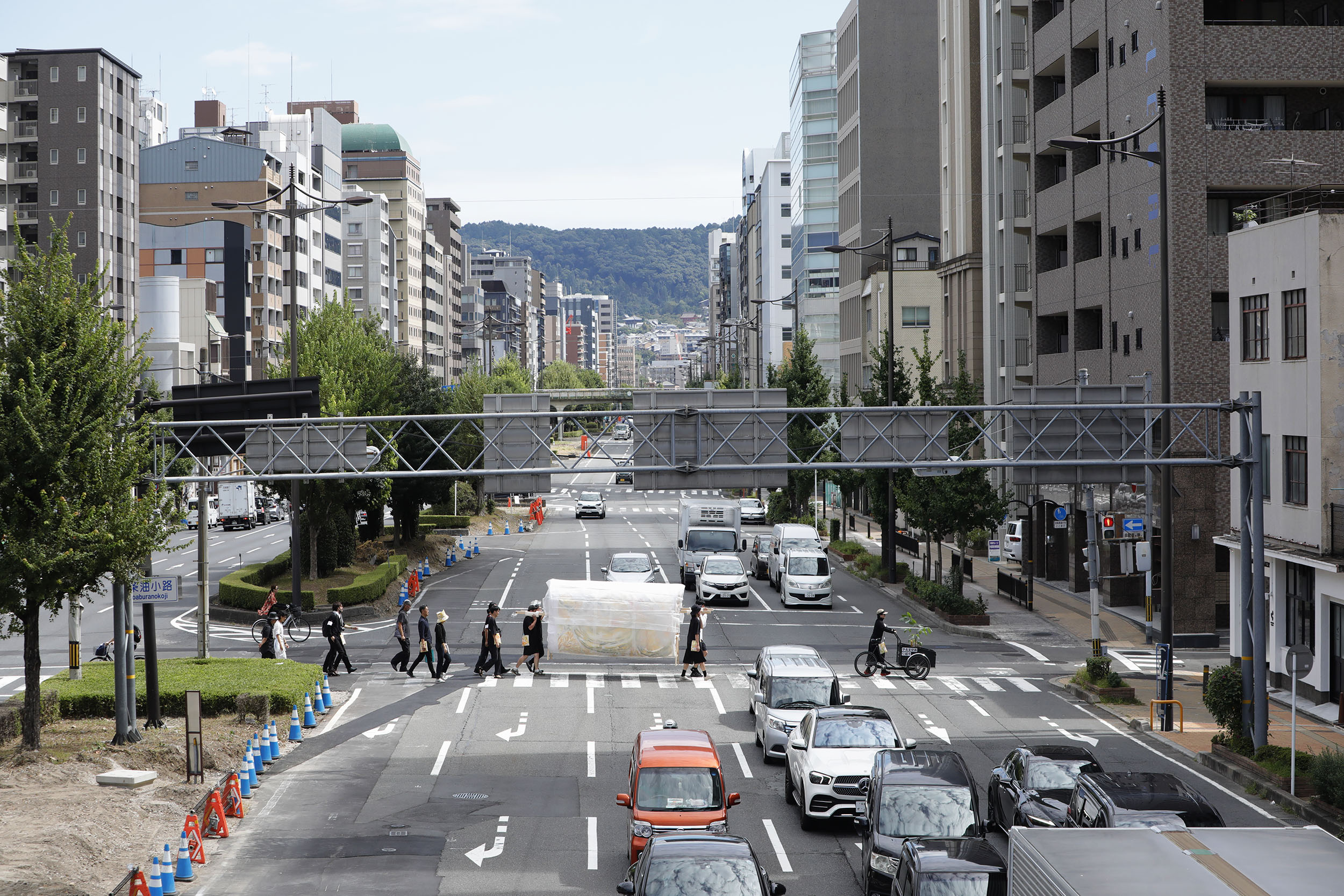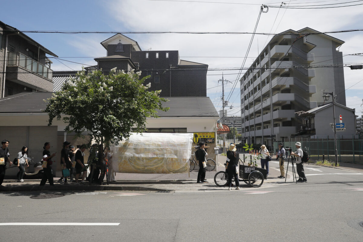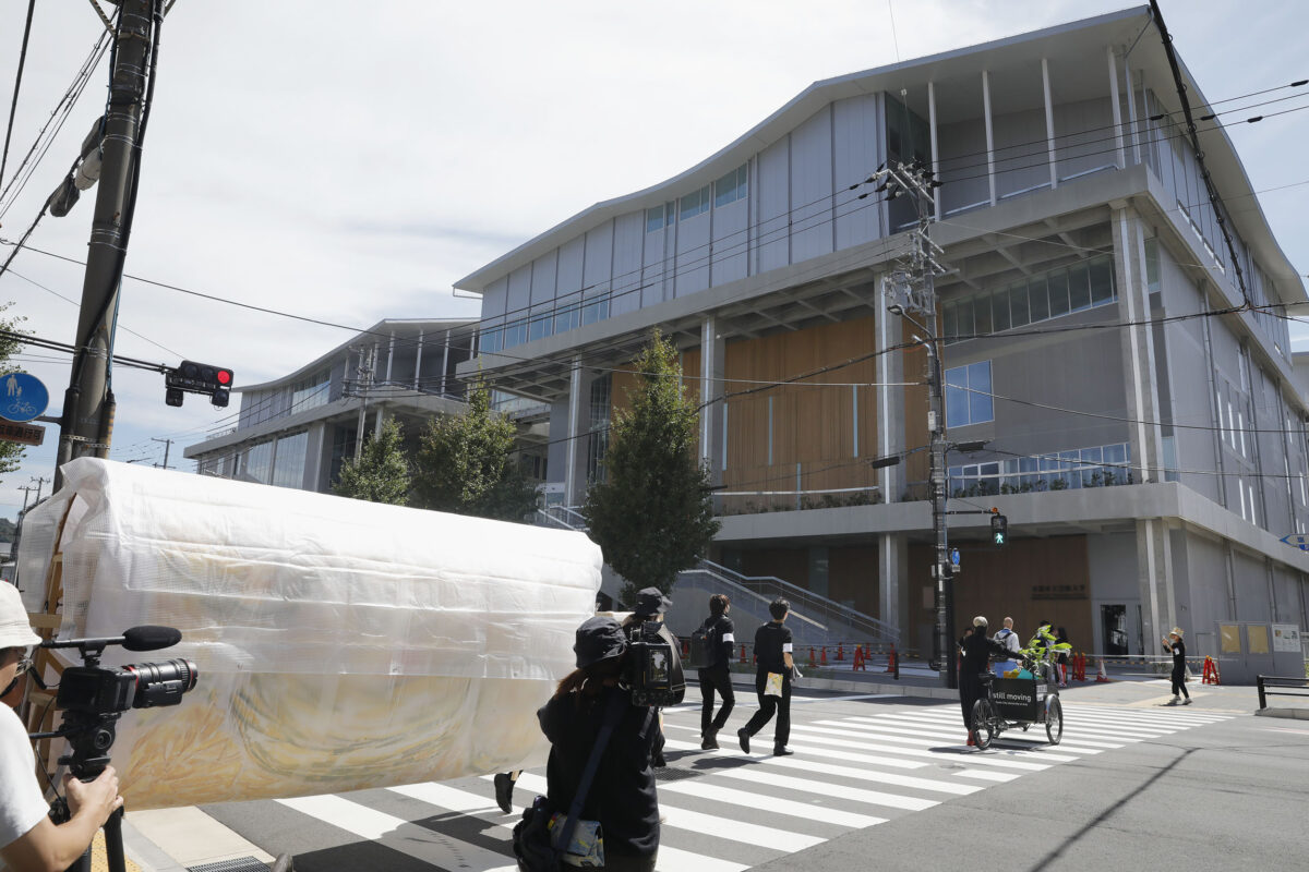 2023年9月25日(月)、旧@KCUAから新キャンパスまでの「引越し」の日を迎えました。壁画を楕円柱型の土台に巻き付け、4人で担げるようにセッティングをしました。また、警察署からは道路使用の許可証をいただきました。