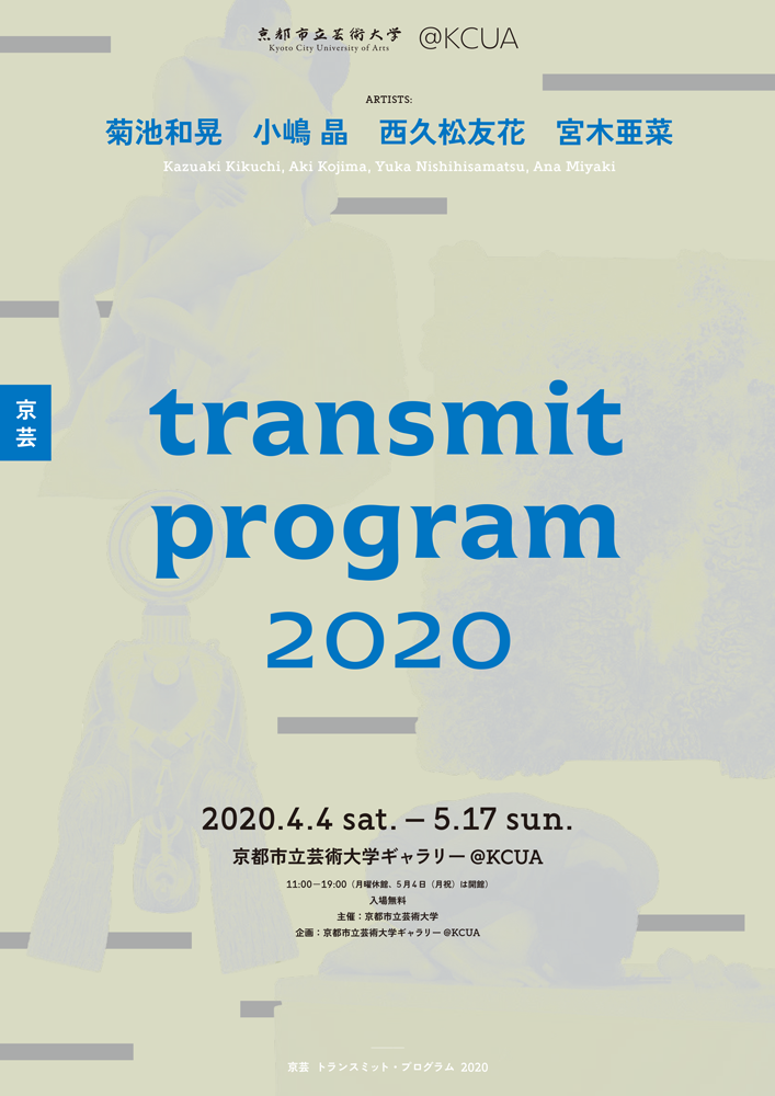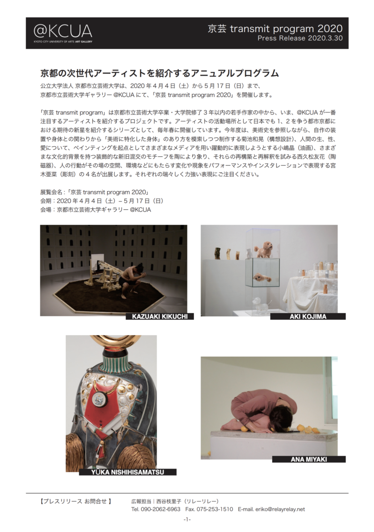 The annual KCUA Transmit Program features emerging artists selected from BFA, MFA, or PhD degree holders who graduated from Kyoto City University of Arts (KCUA) within the past three years. Through this program, @KCUA introduces artists emerging from the Japanese cultural capital and provides support for these artists throughout the school year (April to March).