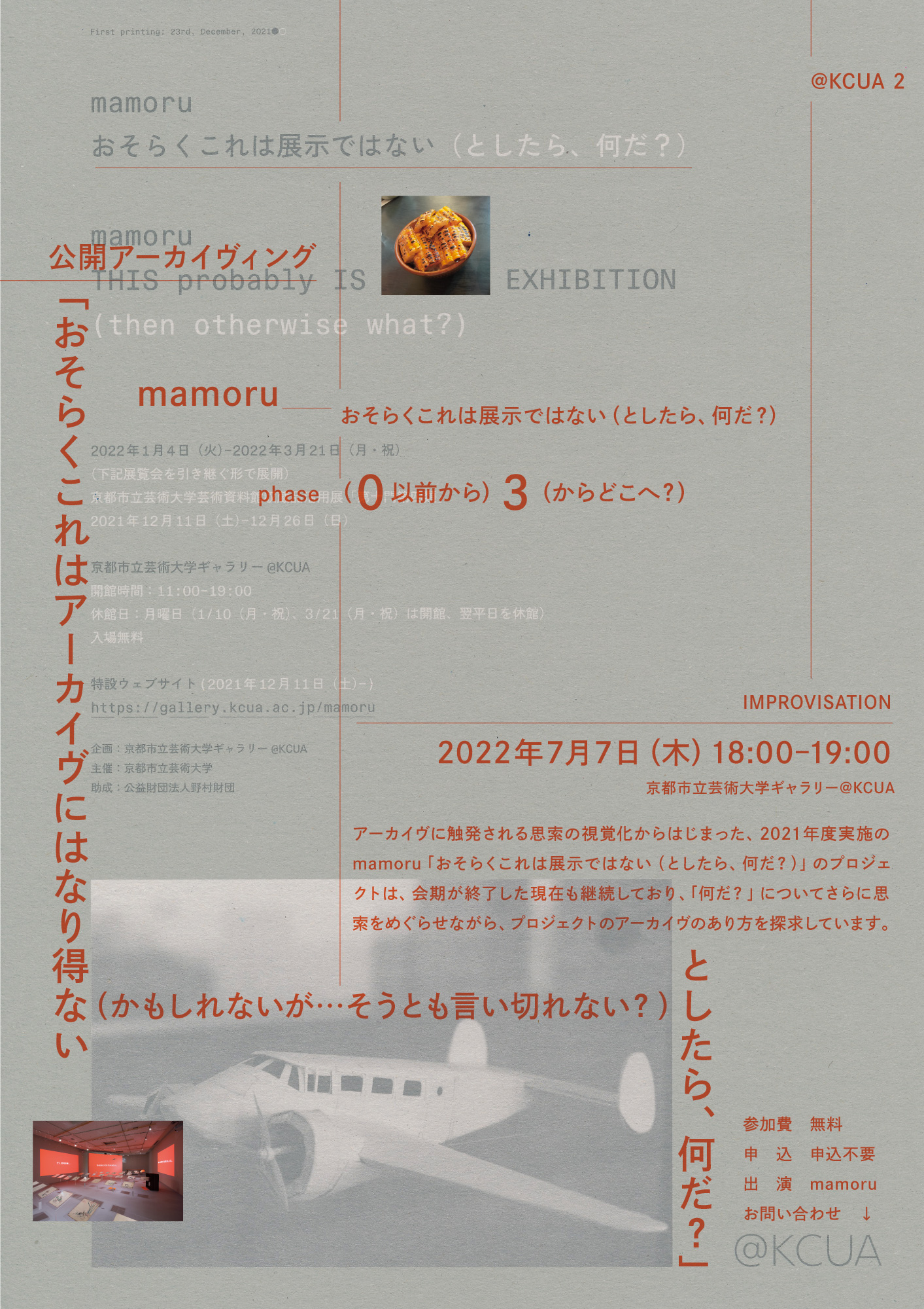アーカイヴに触発される思索の視覚化からはじまった、2021年度実施のmamoru「おそらくこれは展示ではない(としたら、何だ?)」のプロジェクトは、会期が終了した現在も継続しており、「何だ?」についてさらに思索をめぐらせながら、プロジェクトのアーカイヴのあり方を探求しています。
